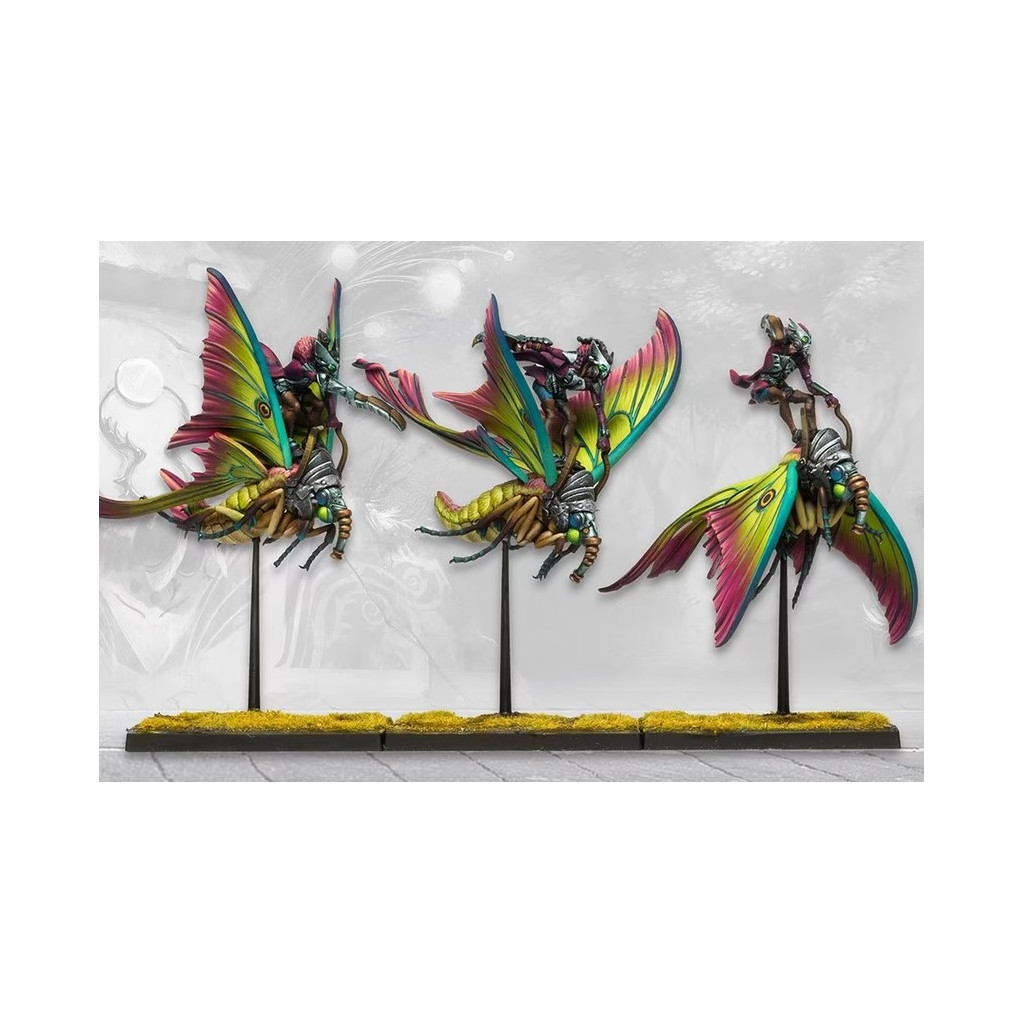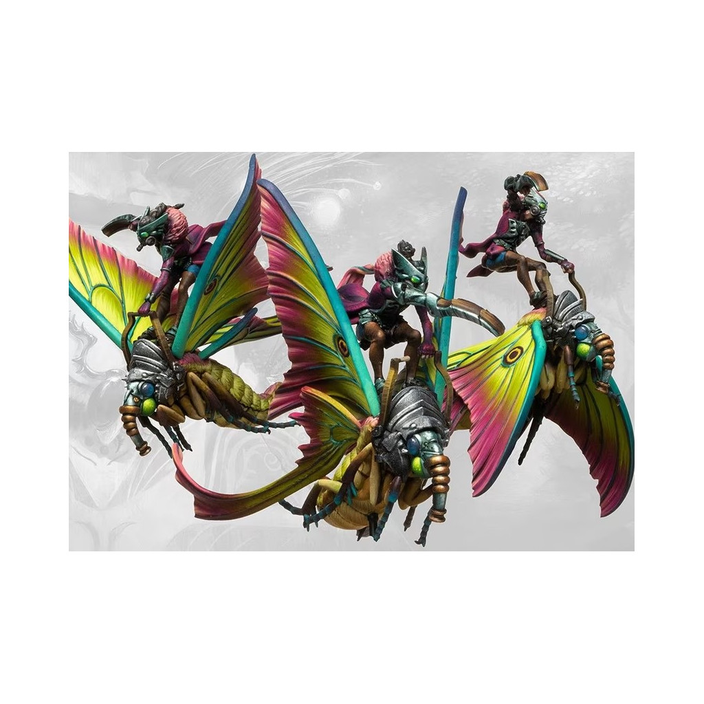 Lunopeth Moths were tamed and bound millennia ago by the Weaver Courts. Long lines of these night flyers have been life-bound to the weavers for so long, they are now an inseparable part of their society. The tangled terrain and verticality of the Weaver Domains lends itself to flying mounts. Their delicate bodies do not lend themselves well to the rigors of combat, but the Weavers have compensated for this, arming their riders with ranged weapons. The Sciathan warriors are able to hurl noxious pods of awakened seeds on their foe, equipped to protect themselves from the inevitable fumble as they cast their deadly cargo with the aid of curved gloves deep into the ranks of the enemy.