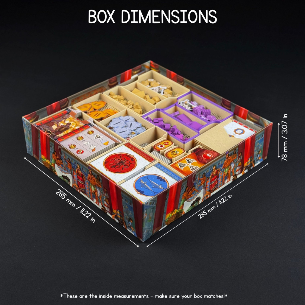 Step into the Bronze Age with maximum clarity and smooth gameplay – this insert for Minos: Dawn of the Bronze Age, including the Dawn of Faith expansion, delivers efficient component organization, significantly speeds up setup and teardown, and keeps your play area clean and structured. Every element has its place, allowing you to fully focus on strategy, trade, and building your civilization without unnecessary clutter.