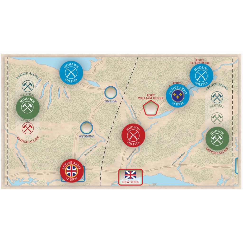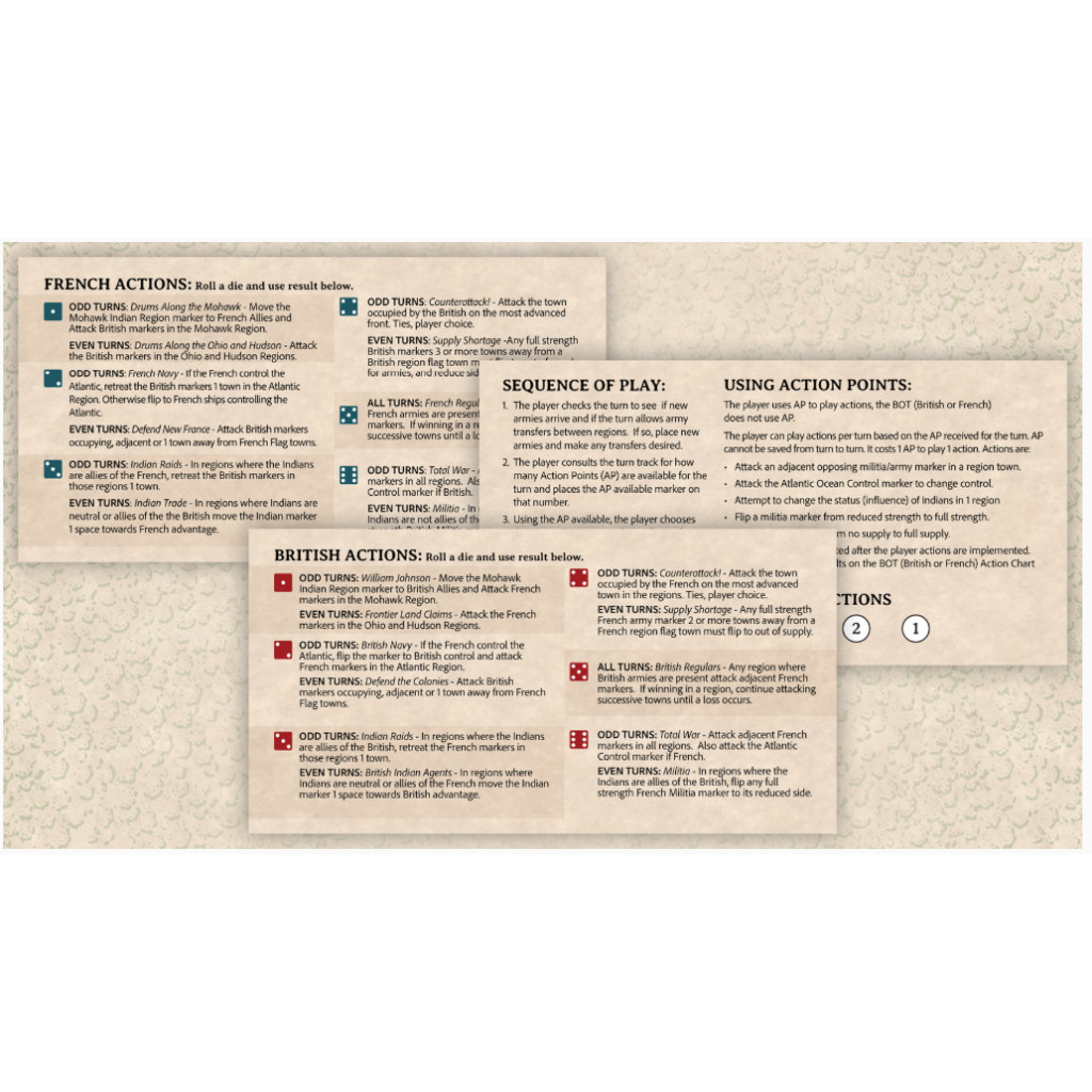 French and Indian War Solitaire, the sister game to War of 1812 Solitaire, allows the player to command the French or British side in the war that decides the fate of North America. The game introduces some new concepts to the series. In the French and Indian War, regional militia and Indians play a large role. Indians affect attacks in regions depending on what side they allied with.