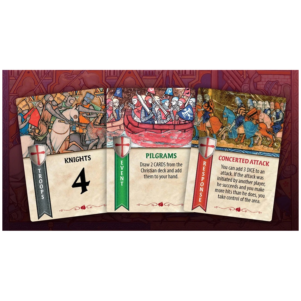 • Double-sided rigid game board (one side for the 1st and 3rd Crusades, the other for the 2nd Crusade and Saladin)