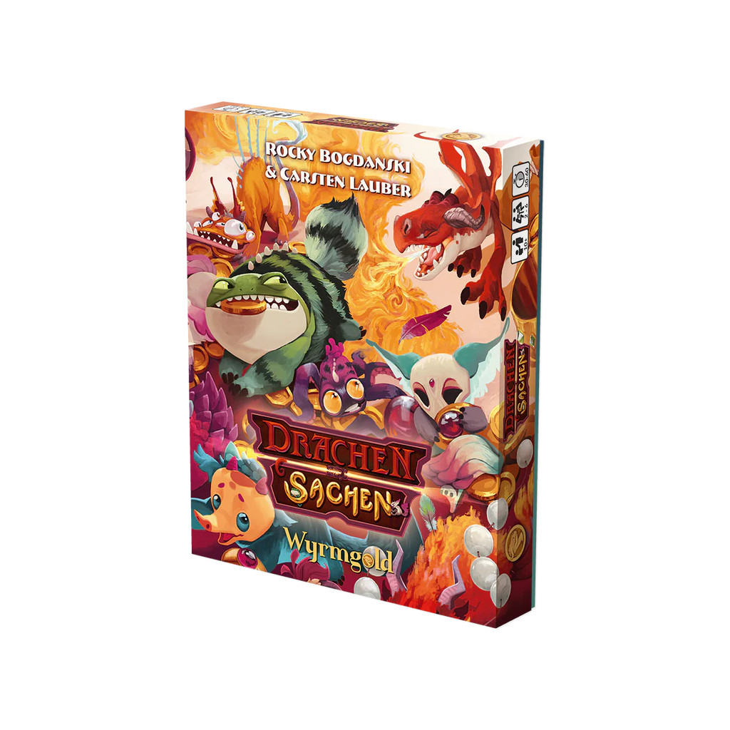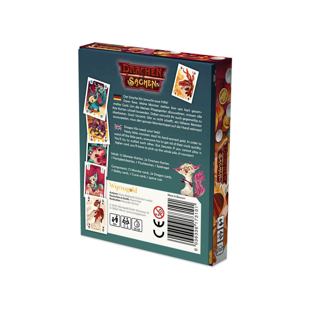 Dachensachen from Carsten Lauber and Rocky Bogdanski is a fast and easy to learn card game for 2-6 players. Playing their cards skillfully, players aim to get rid of all of their hand cards, but every card has to be higher than the one before. Thankfully, you'll discover dragon cards that can change your fate. Every game round is slightly different as rules change or disappear entirely.