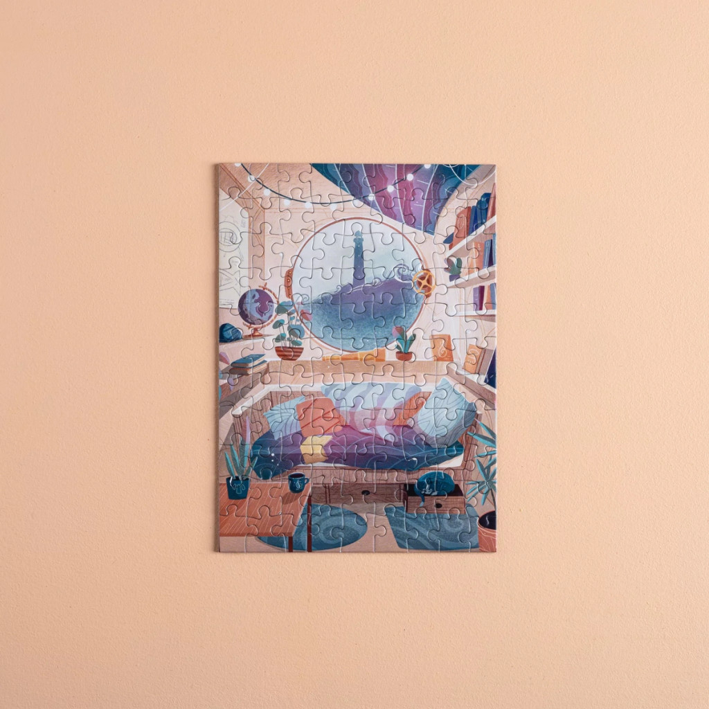 Le mini puzzle Hublot est un puzzle composé de 99 pièces de la marque Les éditions Heol. Illustré par Eor Glas, un artiste français, ce puzzle vous installe dans une chambre cosy avec un grand hublot en guise de fenêtre, vous donnant une vue sur la mer unique !