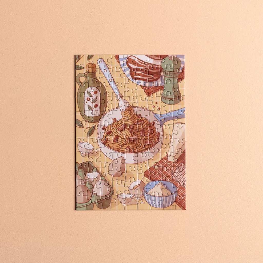 Le mini puzzle Les Pâtes Carbonara est un puzzle composé de 99 pièces de la marque Les éditions Heol. Illustré par Servane, une artiste française, ce mini-puzzle illustre une assiette de pâtes carbonara à l’italienne, avec une fourchette souriante s’amusant à tournoyer dans les tagliatelles !