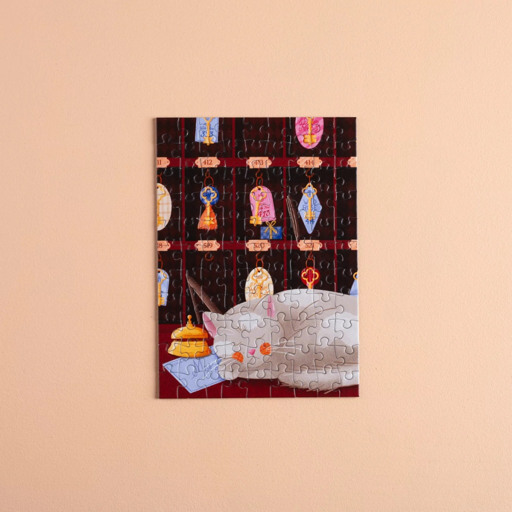Le mini puzzle Lobby Cat est un puzzle composé de 99 pièces de la marque Les éditions Heol. Illustré par Marion Brouillon, une artiste française, ce micro puzzle vous emmène dans un hôtel, et vous met face au maître de ces lieux : le gardien des clés, qui n’est nul autre que… le chat mignon faisant une sieste sur le comptoir de l’accueil !