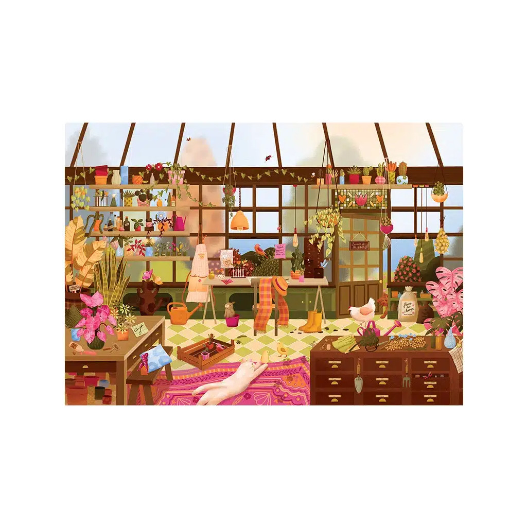 Le puzzle Dans la Serre est un puzzle Trevell composé de 1000 pièces. Illustré par Marion Brouillon, ce puzzle illustre une grande serre, à la fois atelier coloré et refuge pour les petits animaux. Ce lieu lumineux abrite une multitude de plantes, petites et grandes, dans une atmosphère paisible et pleine de vie.