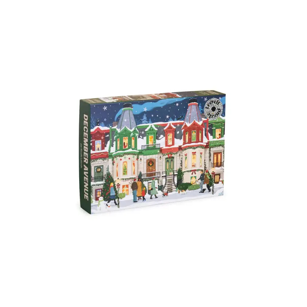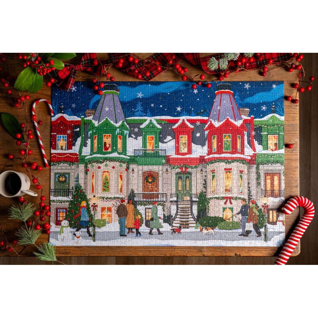 Le puzzle December Avenue de Trevell de 1000 pièces. Illustré par Nicolle Lalonde, baladez-vous dans une ville enneigée et décorée aux couleurs de Noël. Aux fenêtres, on aperçoit des sapins, des chats et des scènes de vie joyeuses. Malgré l’hiver, la rue est animée, des bonhommes de neige (et des toutous de neige) sont façonnés.
