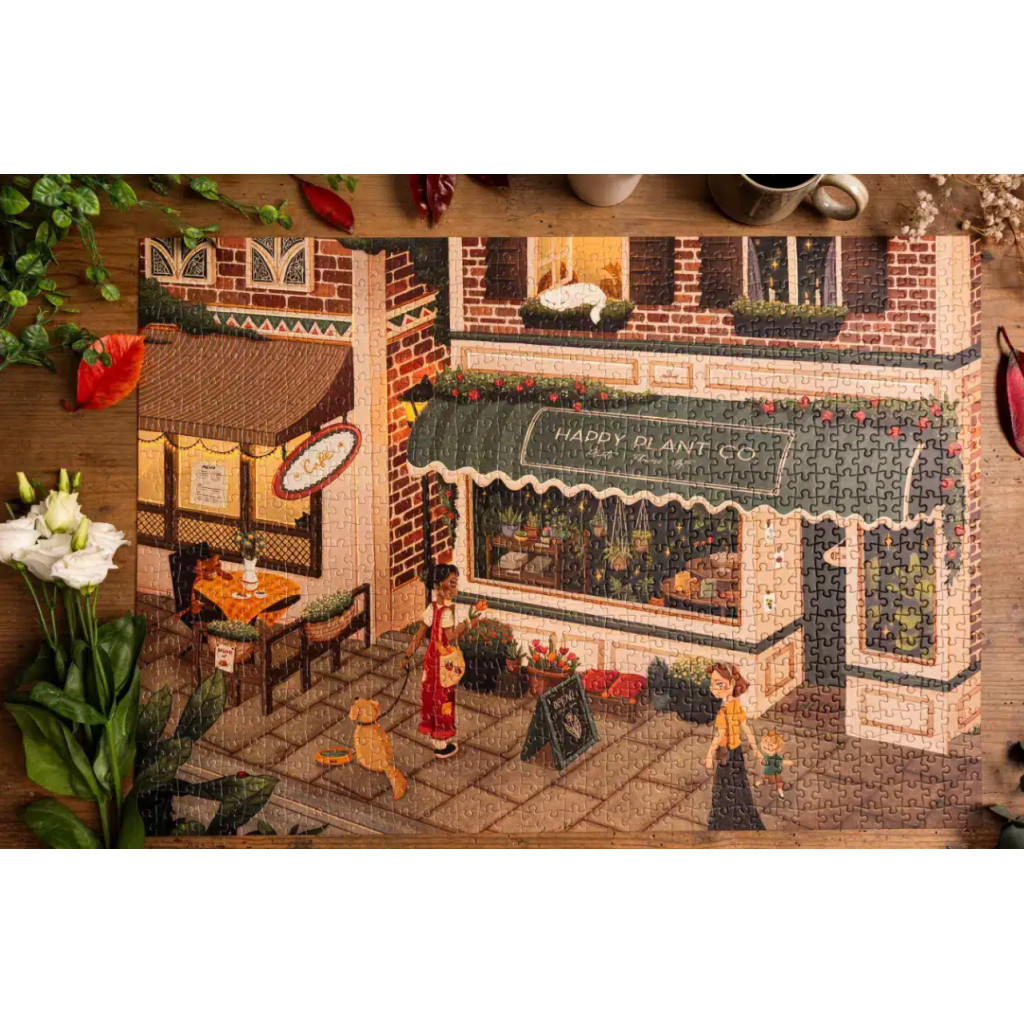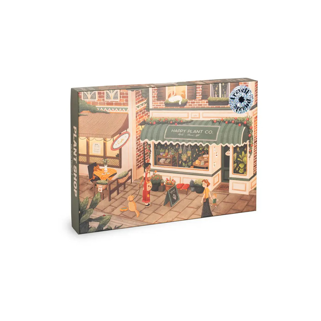Le puzzle Plant Shop de Trevell de 1000 pièces. Illustré par Anna Vaughn J., ce puzzle nous mène vers des devantures dont un petit café (un QG à chats) et une mystérieuse boutique de plantes. Celles-ci ne font pas que sublimer votre intérieur, les plantes et succulentes ramènent de la magie et de la gaieté ! Plutôt monstera ou alocasia ?