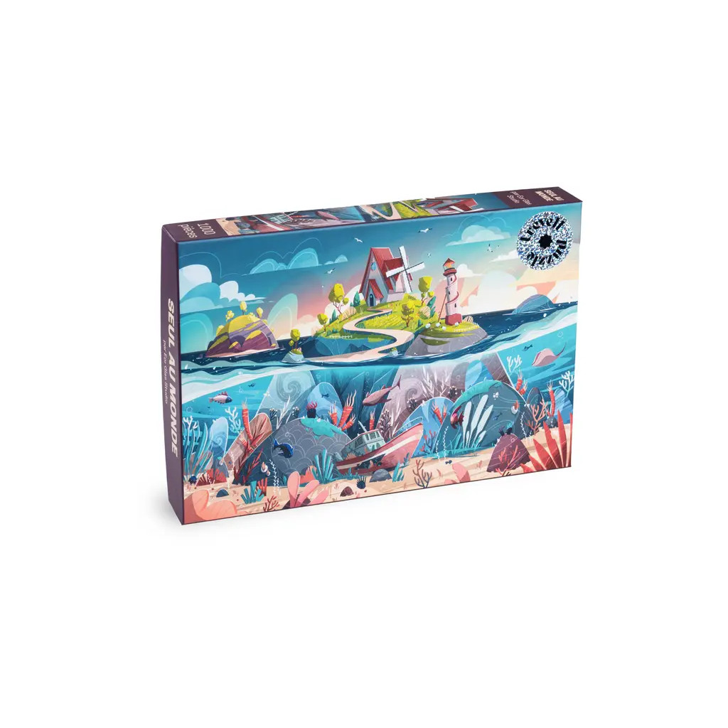 Le puzzle Seul au Monde est un puzzle Trevell de 1000 pièces. Illustré par Etienne Péran (Eor Glas Studio), ce puzzle vous invite à trouver refuge sur une petite île isolée, coupée du monde. Ici, vous pourrez admirer la beauté du ciel et les trésors du fond de la mer. Besoin d’un dépaysement ?
