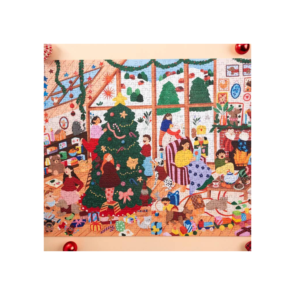 Le puzzle Un Noël en famille est un puzzle de 1000 pièces de la marque Les éditions Heol. Illustré par Anaïs Sanchez, une artiste française. Ce puzzle illustre une grande fête de Noël où toute la famille s’est réunie pour partager un moment chaleureux et festif. Petits et grands, chiens et chats profitent ensemble de la magie des fêtes.