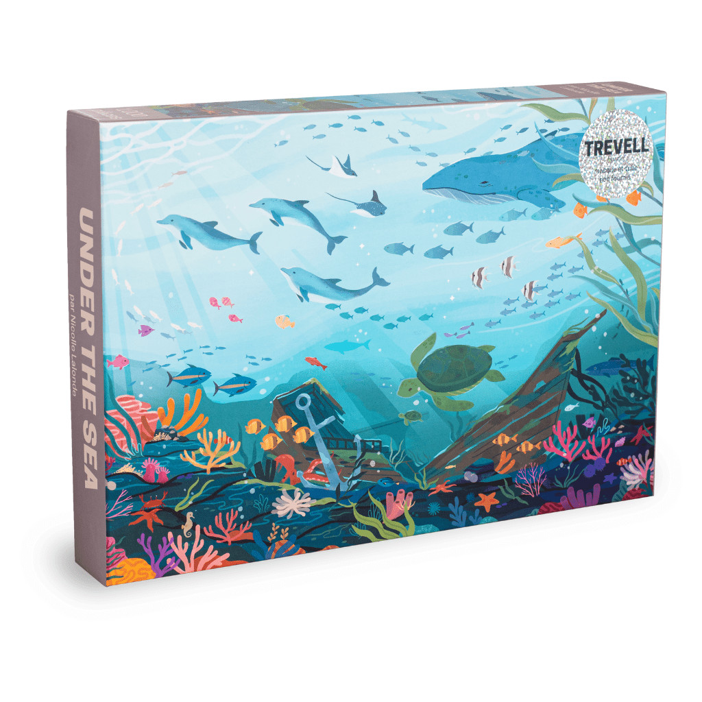 Le puzzle Under the Sea de Trevell de 1000 pièces. Illustré par Nicolle Lalonde, plongeons en haute mer, là où la faune et la flore sous-marine sont denses, variées et colorées. Une majestueuse baleine, une tortue et son bébé, des dauphins, des raies et plein de petits poissons nagent paisiblement aux côtés d’une ancre et vieille épave de bateau.