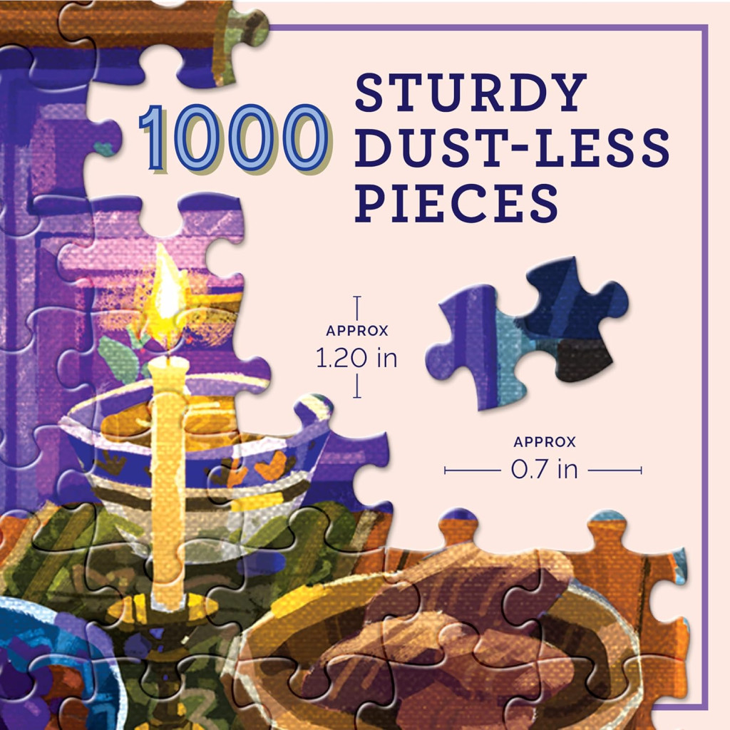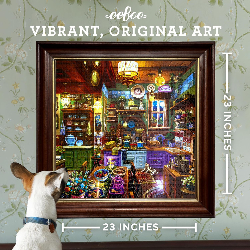 Plongez dans l'atmosphère calme et chaleureuse d'une cuisine après la tombée de la nuit. Chaque détail, des étagères chargées de céramiques aux rayons de lune caressant le sol, crée une expérience à la fois intime et magique.