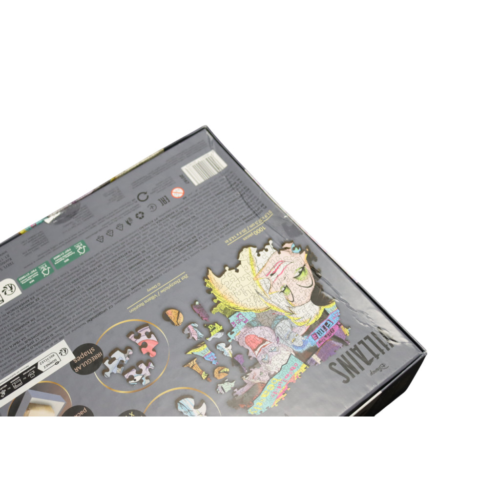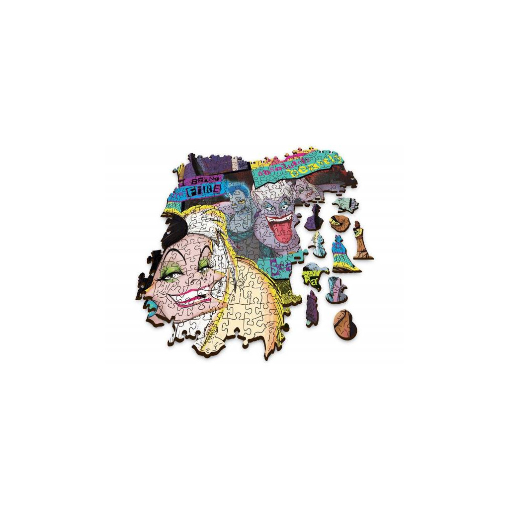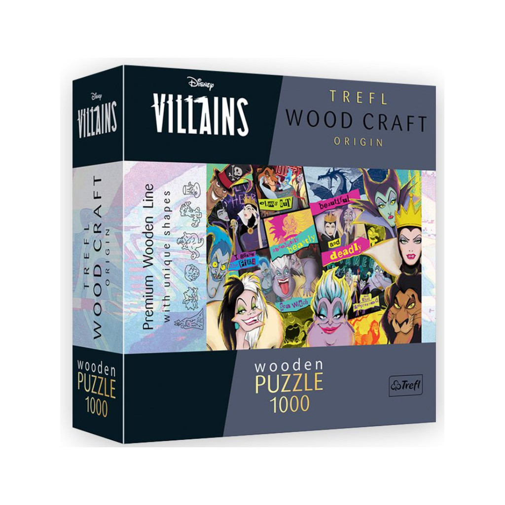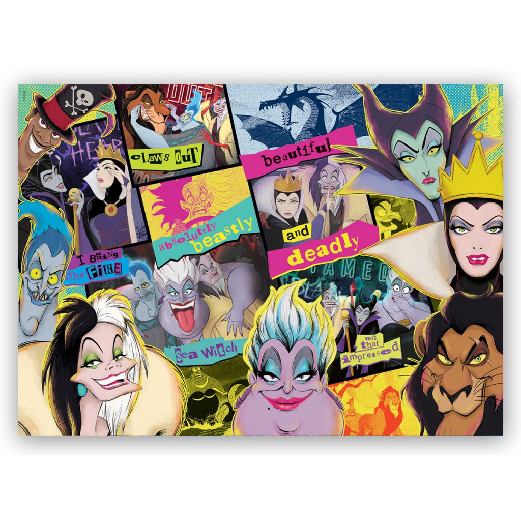 Retrouvez dans ce puzzle tous les plus célèbres méchants de Disney. Ils ont été des stars dans nos disneys animés préférés. Aujourd'hui, Hadès, Cruella d'enfer, Scar, la méchante Reine... Ils vous attendent tous dans ce puzzle en bois 1000 pièces haut en couleur.