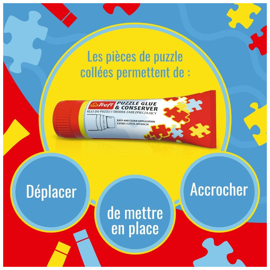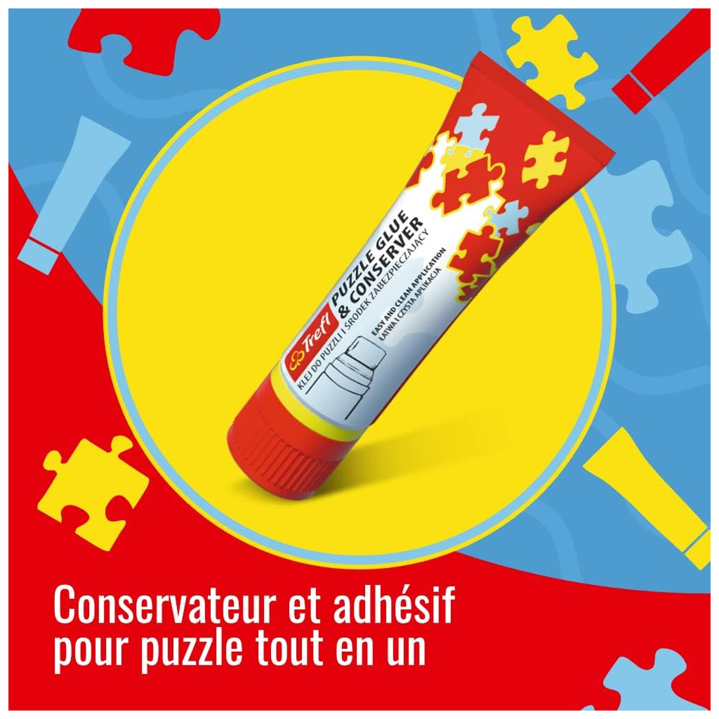 Colle pour puzzles Trefl en tube avec éponge pour une application facile et propre. C’est à la fois un fixateur et une colle pour puzzles. Les puzzles assemblés grâce à cette colle peuvent être facilement déplacés, posés ou accrochés, et la couche protectrice les protège des salissures. Appliquez la colle uniformément sur toute la surface de l’image. Laissez sécher, et voilà, c’est prêt !