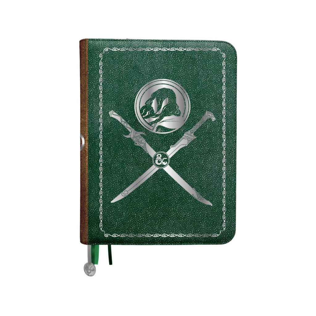 - Extérieur en similicuir vert sauge et brun avec détails argentés ; intérieur en suédine douce orné d’une carte originale des Royaumes Oubliés par Deven Rue