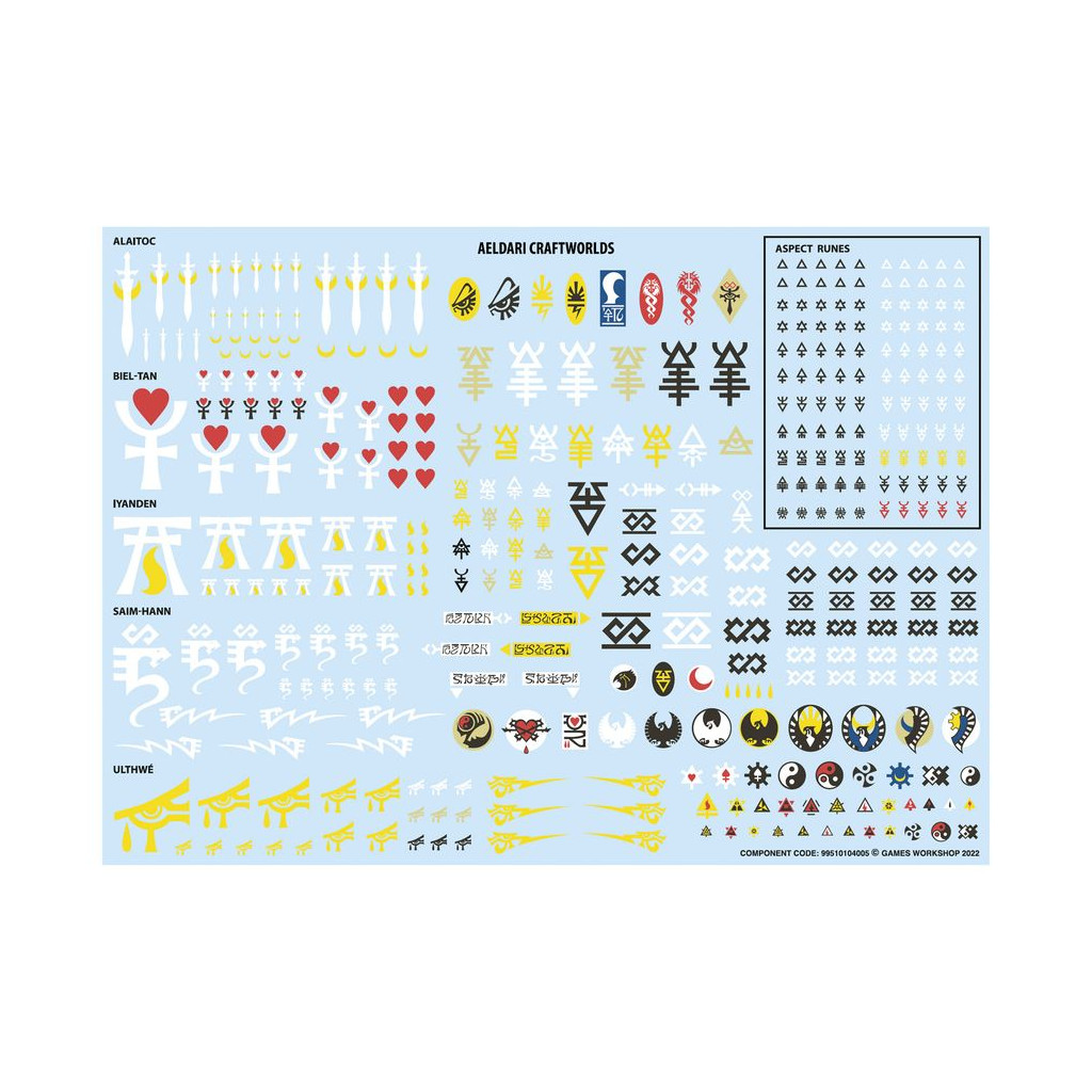 Ce kit inclut également 1x Planche de Décalcos des Vaisseaux-mondes Aeldari, comportant 378 décalcos de grande qualité. Cela comprend des symboles pour les vaisseaux-mondes Alaitoc, Biel-Tan, Iyanden, Saim-Hann et Ulthwé, ainsi que des runes aspects et autres marquages pour décorer vos figurines.