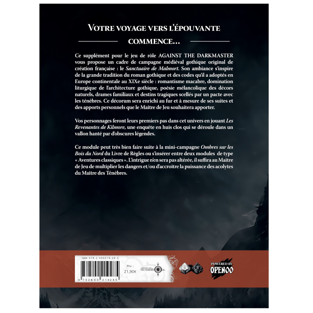 Ce supplément pour le jeu de rôle AGAINST THE DARKMASTER vous propose un cadre de campagne médiéval gothique original de création française : le Sanctuaire de Malmort. Son ambiance s’inspire de la grande tradition du roman gothique et des codes qu’il a adoptés en Europe continentale du XIXe siècle : romantisme macabre, domination liturgique de l’architecture gothique, poésie mélancolique des décors naturels, drames familiaux et destins tragiques scellés par un pacte avec les ténèbres. Ce décorum sera enrichi au fur et à mesure de ses suites et de ses apports personnels que le Maître du Jeu souhaitera apporter.
