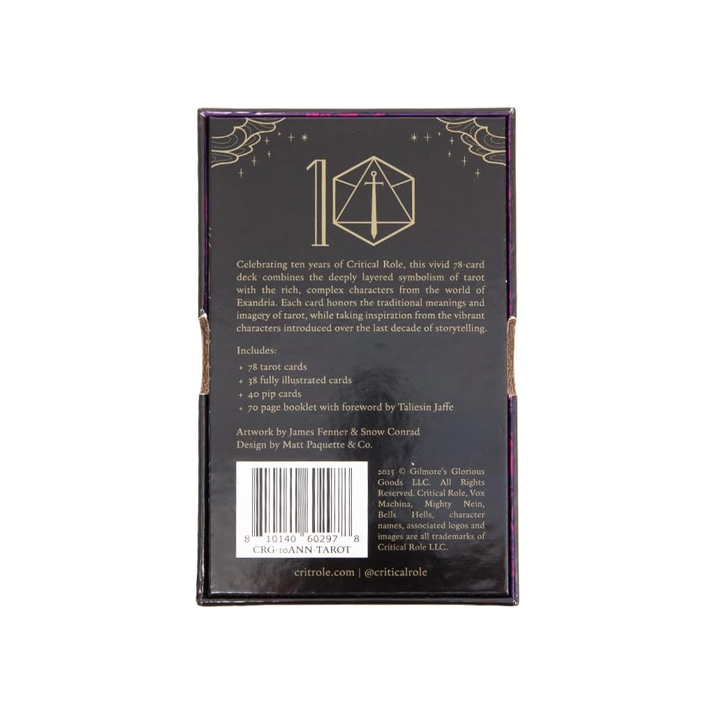 Que réserve l’avenir à tous les Exandriens, mortels comme immortels ? Consultez l’univers grâce à ce superbe jeu de tarot célébrant les 10 ans de Critical Role, mettant en scène de magnifiques représentations des héros chanceux (et parfois malchanceux) des trois campagnes. Trouvez conseils et nouvelles perspectives sur le passé, le présent et le futur grâce à 22 illustrations couleur des personnages pour les arcanes majeurs, 16 illustrations tonales pour les cartes de cour des arcanes mineurs, et 40 cartes numérales conçues spécialement pour chaque couleur.