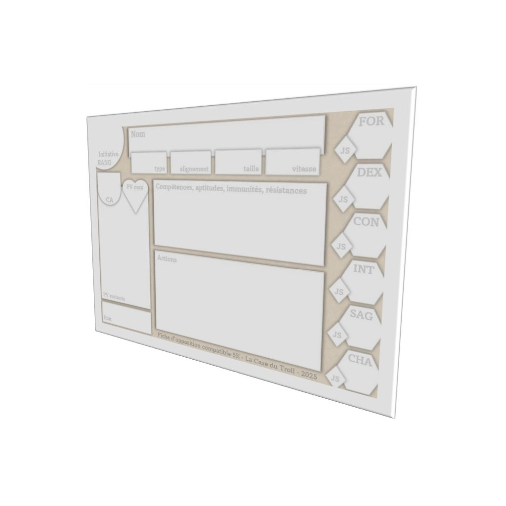 Bloc de fiches mémo format A6 (15x10cm), 50 feuillets recto/verso pour noter les caractéristiques et état des créatures, PNJ, et autres oppositions que les joueurs peuvent rencontrer durant leurs aventures.
