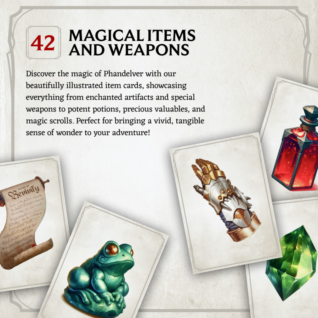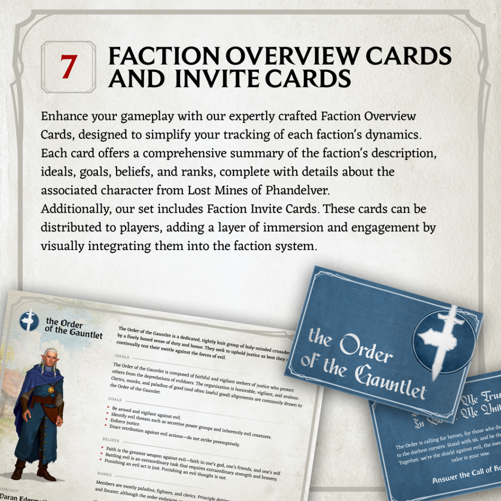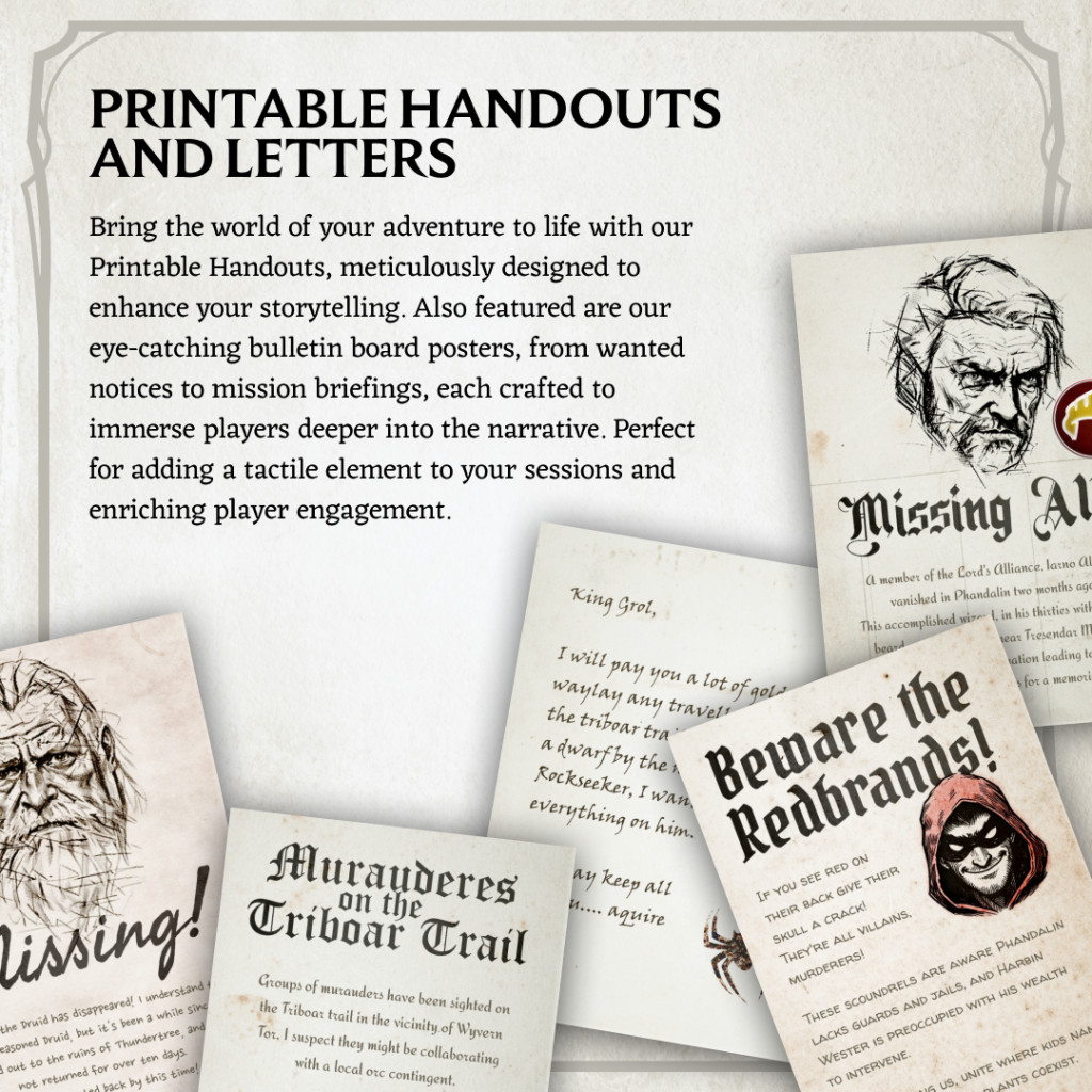 Améliorez instantanément votre campagne 5e avec le pack ultime compatible avec Lost Mine of Phandelver, qui contient plus de 200 ressources JDR imprimables, notamment des jetons de monstres, des cartes PNJ, des objets magiques, des documents immersifs, des cartes, des guides de lieux et bien plus encore !