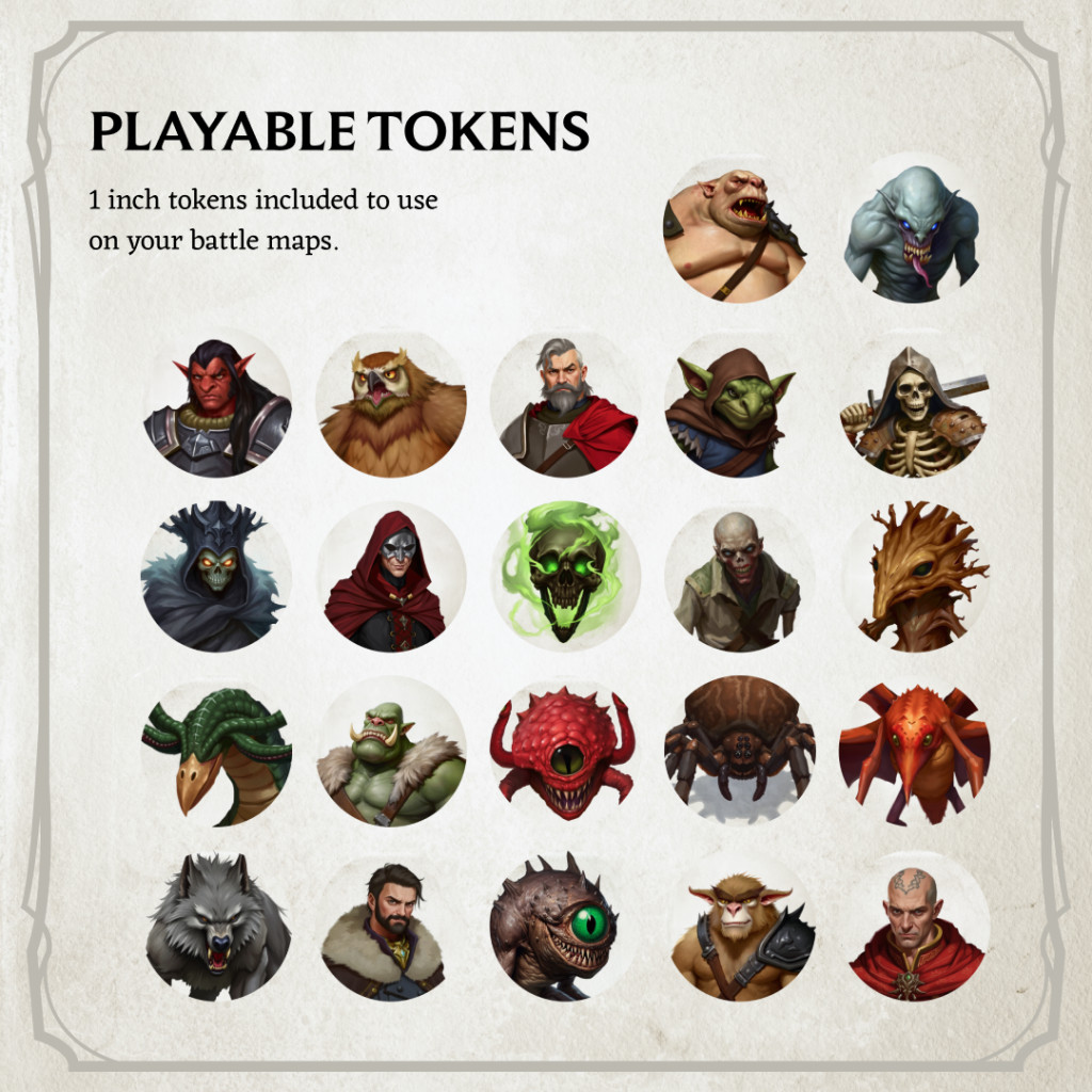 - Cartes de plateau, 1 * 5 pouces (2,5 * 12,7 cm), une fois pliées, elles s'adaptent à une grille de combat standard de 1 pouce