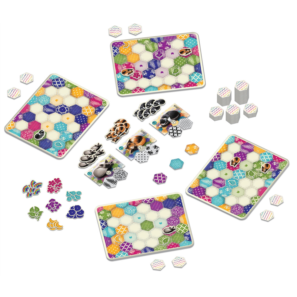 Les tours sont simples : choisissez une tuile « patch » de votre main et cousez-la dans votre courtepointe, puis piochez une nouvelle tuile parmi les trois disponibles. Si vous parvenez à créer un groupe de couleurs, vous pouvez coudre un bouton sur votre courtepointe. Si vous réussissez à former une combinaison de motifs qui attire l’un des chats, il viendra se blottir sur votre ouvrage !