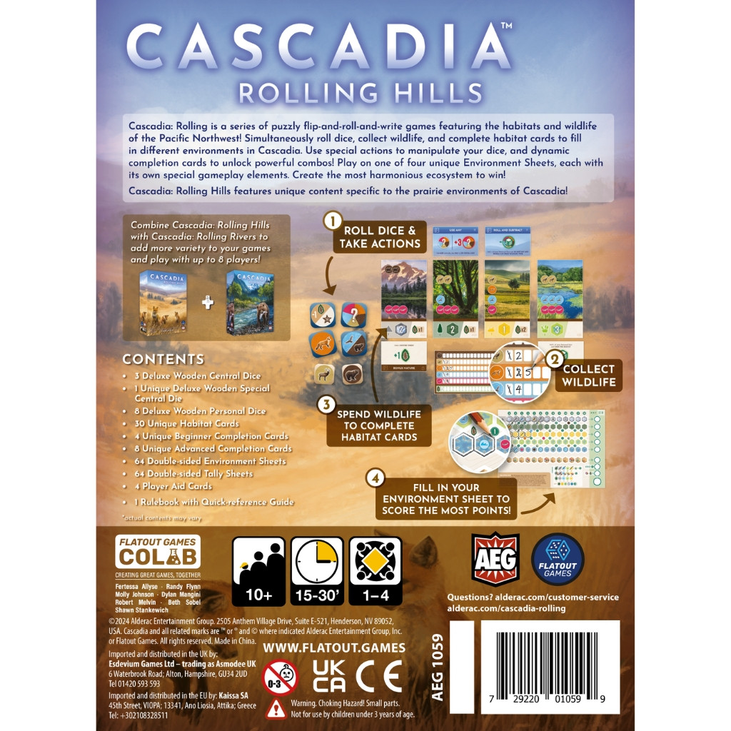 Cascadia Rolling Hills fait partie de Cascadia: Rolling, une série de jeux de flip-and-roll-and-write combinatoires mettant en scène les habitats et la faune du Nord-Ouest Pacifique ! Lancez les dés simultanément, collectez des animaux sauvages et complétez des cartes Habitat pour remplir différents environnements de Cascadia. Utilisez des actions spéciales pour manipuler vos dés et des cartes Objectif dynamiques pour déclencher de puissants enchaînements !