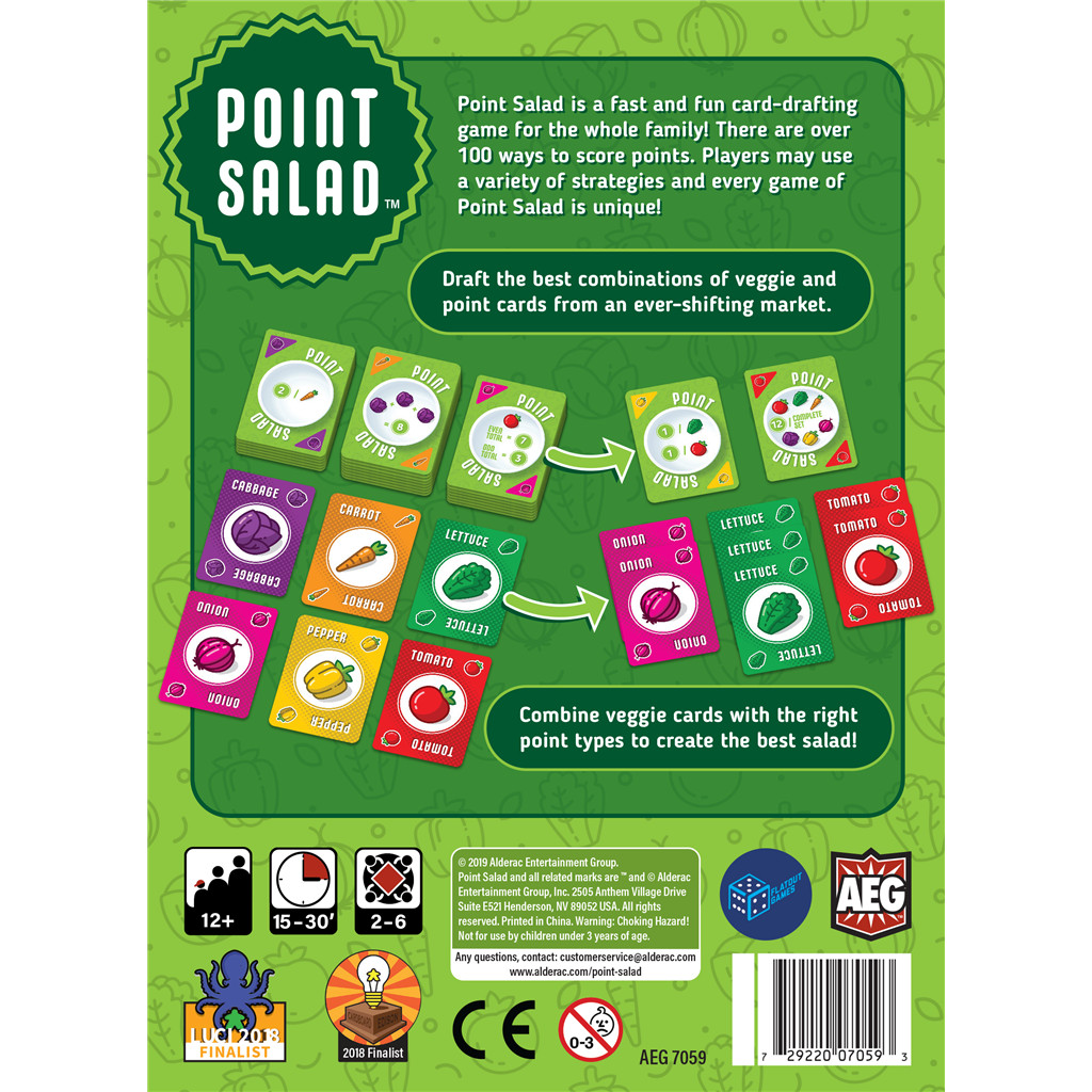 Partez pour une aventure culinaire avec Point Salad, le jeu de draft de cartes palpitant publié par Alderac Entertainment Group. Parfait pour les soirées jeux en famille, Point Salad offre un délicieux mélange de rapidité et de stratégie.