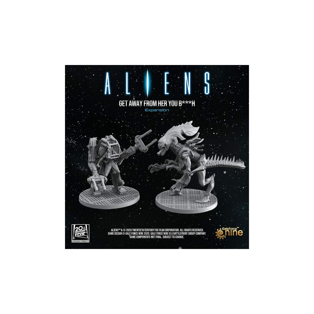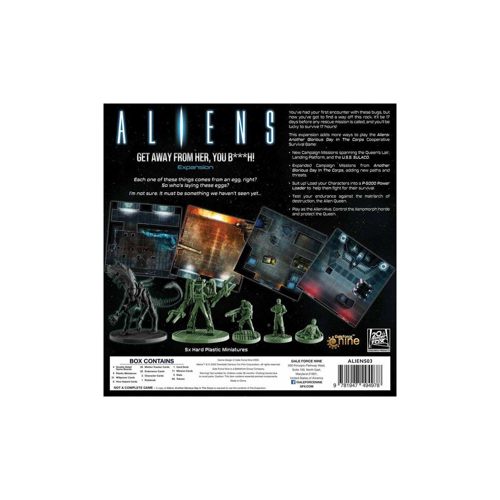 Aliens : Get Away From Her, You B***h ! élargit la campagne avec cinq missions supplémentaires et ajoute cinq nouvelles missions de chasse aux insectes, dont deux avec la reine des aliens. Elle permet également à un joueur de jouer le rôle de la ruche extraterrestre, ce qui vous donne une autre façon de jouer aux missions de campagne et de chasse aux insectes. Cette extension n'est pas un jeu autonome. Vous aurez besoin d'une copie de Aliens : Another Glorious Day in the Corps pour utiliser cette extension.