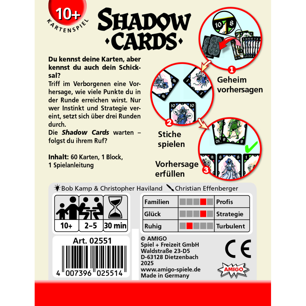 Dans Shadow Cards, vous faites une prédiction secrète. Avant chaque tour, vous choisissez deux cartes de votre main dont la valeur détermine les points à marquer. Si vous remportez un pli, vous vous rapprochez de votre prédiction. Seuls ceux qui allient instinct et stratégie s'imposent après trois tours et peuvent remporter la partie.