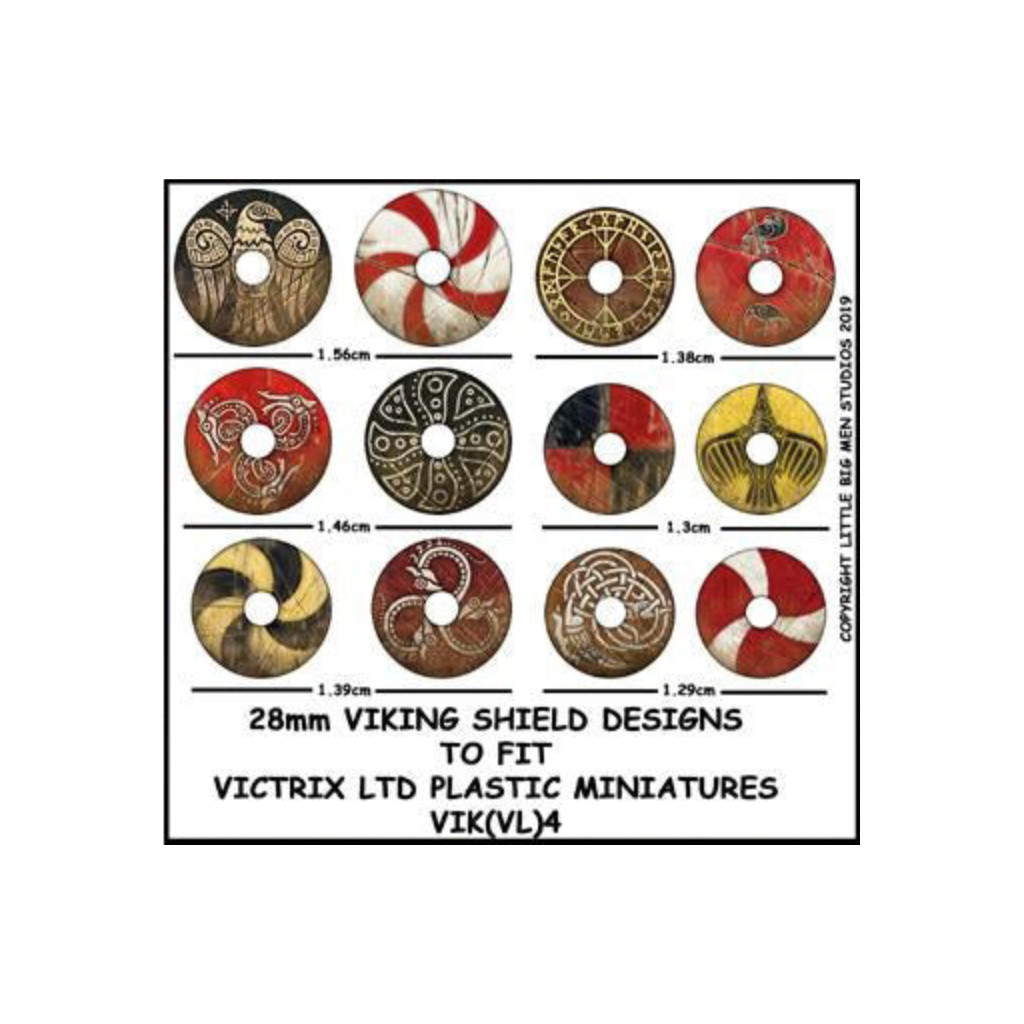 Ce set contient une planche de 12 décalcomanies de boucliers Viking, conçues pour être utilisées avec les figurines de vikings Victrix.