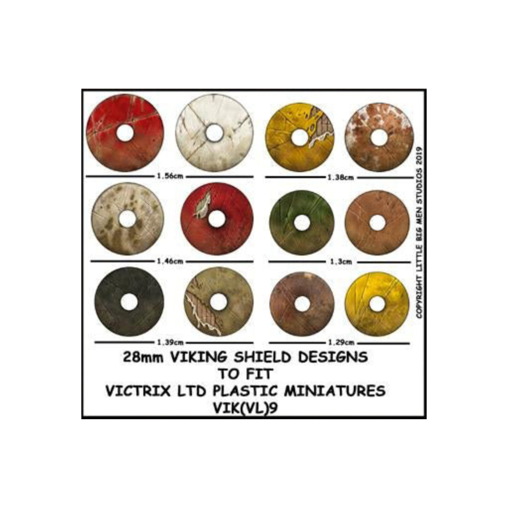 Ce set contient une planche de 12 décalcomanies de boucliers Viking, conçues pour être utilisées avec les figurines de vikings Victrix.
