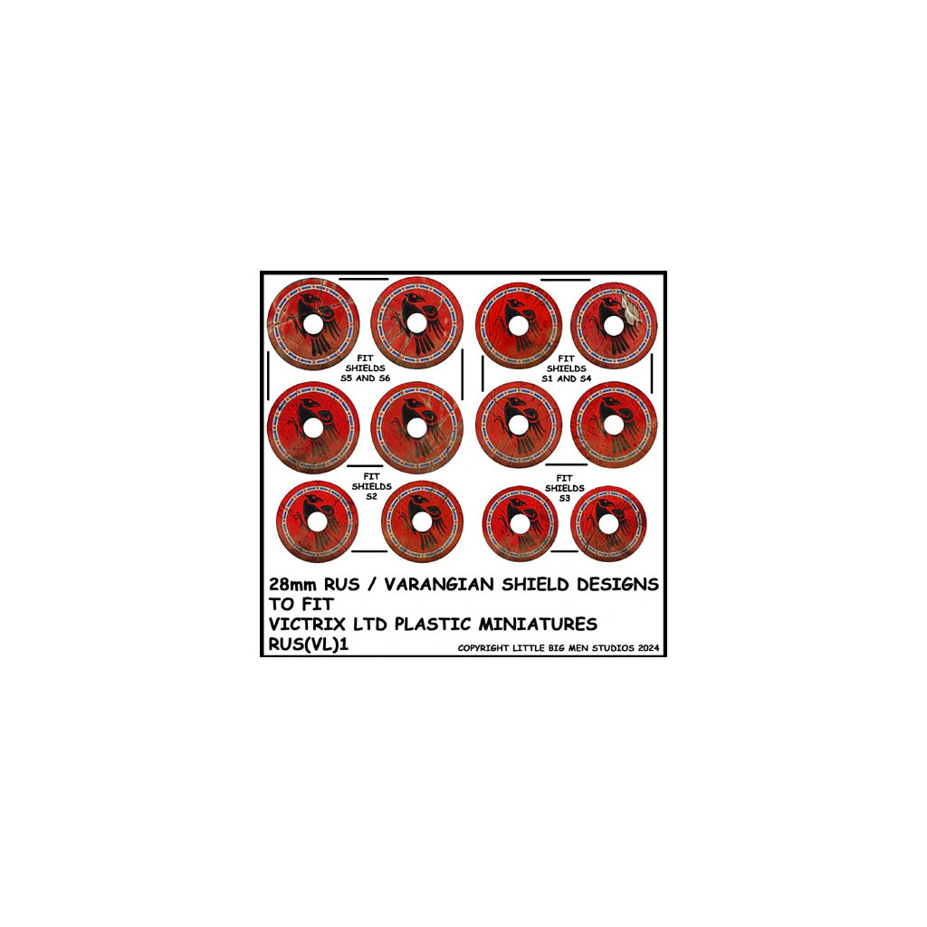 Ce set contient une planche de 12 décalcomanies de boucliers Rus, conçues pour être utilisées avec les figurines de Rus Victrix.