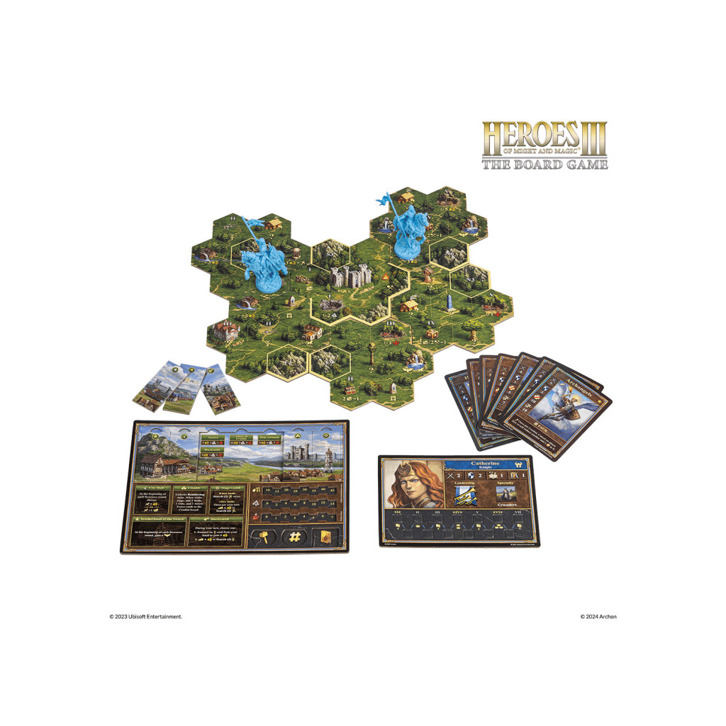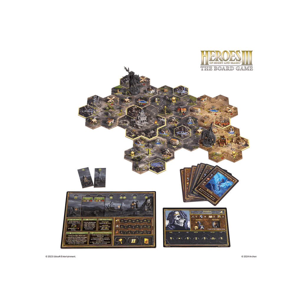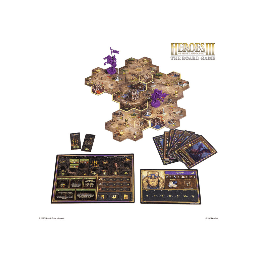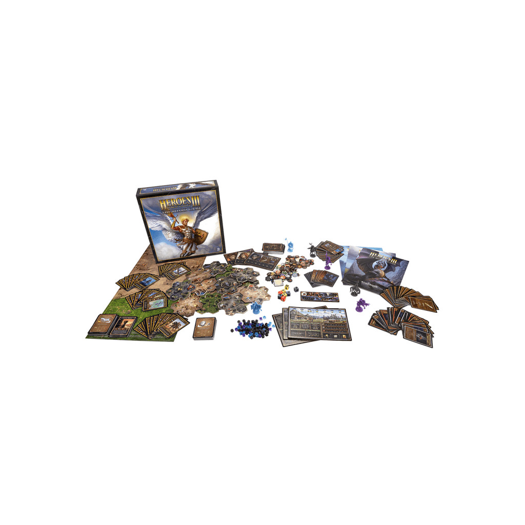 Heroes of Might and Magic III - Le Jeu de Société comprend des scénarios compétitifs, coopératifs et solitaires pour combattre et explorer. Les cartes d'aventure sont représentées par des tuiles, chaque tuile étant divisée en sept champs hexagonaux.