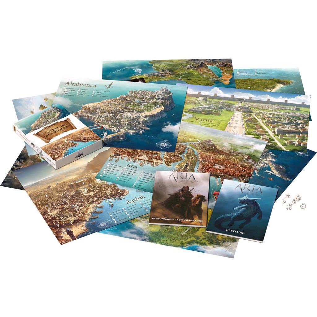 Ce coffret contient les cartes d’Aria, de Kniga, Aqabah, Altabianca, Varna, Esperanza, l’Osmanlie, Irem et le Pays Môn, ainsi qu’une carte du continent d’Aria dans une version à couper le souffle. Vous y trouverez également un bestiaire des créatures de ce continent et un guide des personnages extraordinaires à rencontrer sur ces terres.