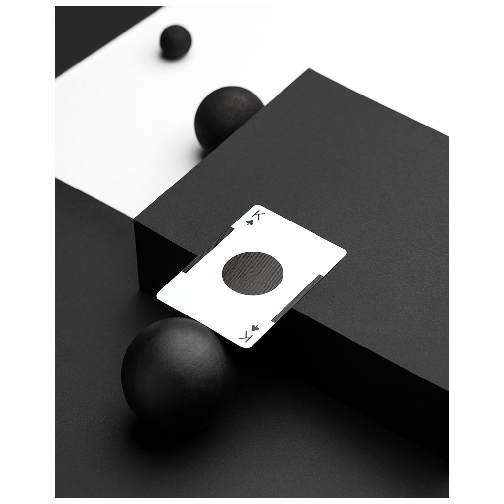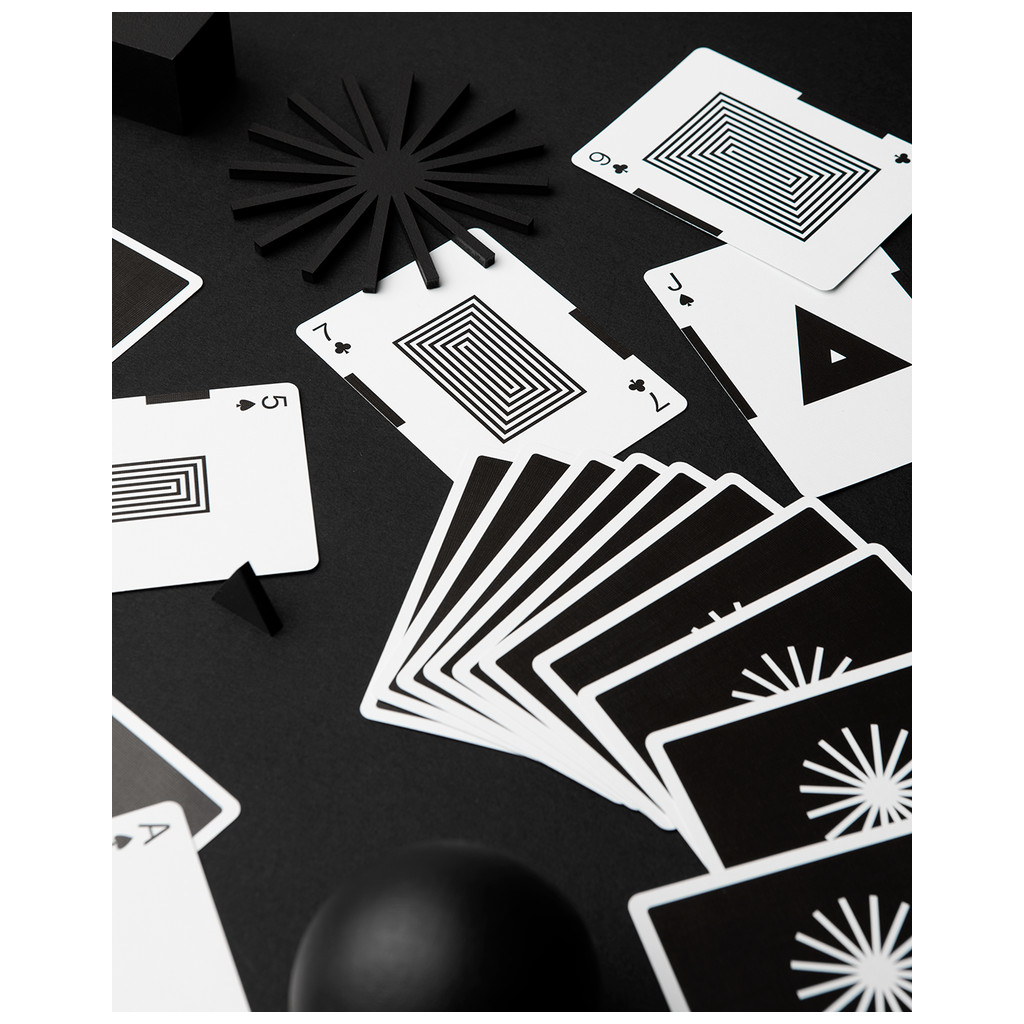 Les cartes Eames "Starburst" affichent le logo Starburst du Eames Office au dos. Cet emblème iconique, récurrent dans l’œuvre de Charles et Ray, symbolise leur énergie créative sans limites—une explosion de lumière atteignant les confins du véritable objectif du design. Le système de numérotation unique des faces des cartes permet aux mouvements de cardistry de devenir des hommages subtils au film classique des Eames, Powers of Ten. Les cartes de cour célèbrent la majesté naturelle qu’ils percevaient dans les formes géométriques élémentaires. Mathématiques, forme et rôle essentiel des contraintes dans le design sont des fils conducteurs tout au long de la vie et de l’œuvre des Eames.