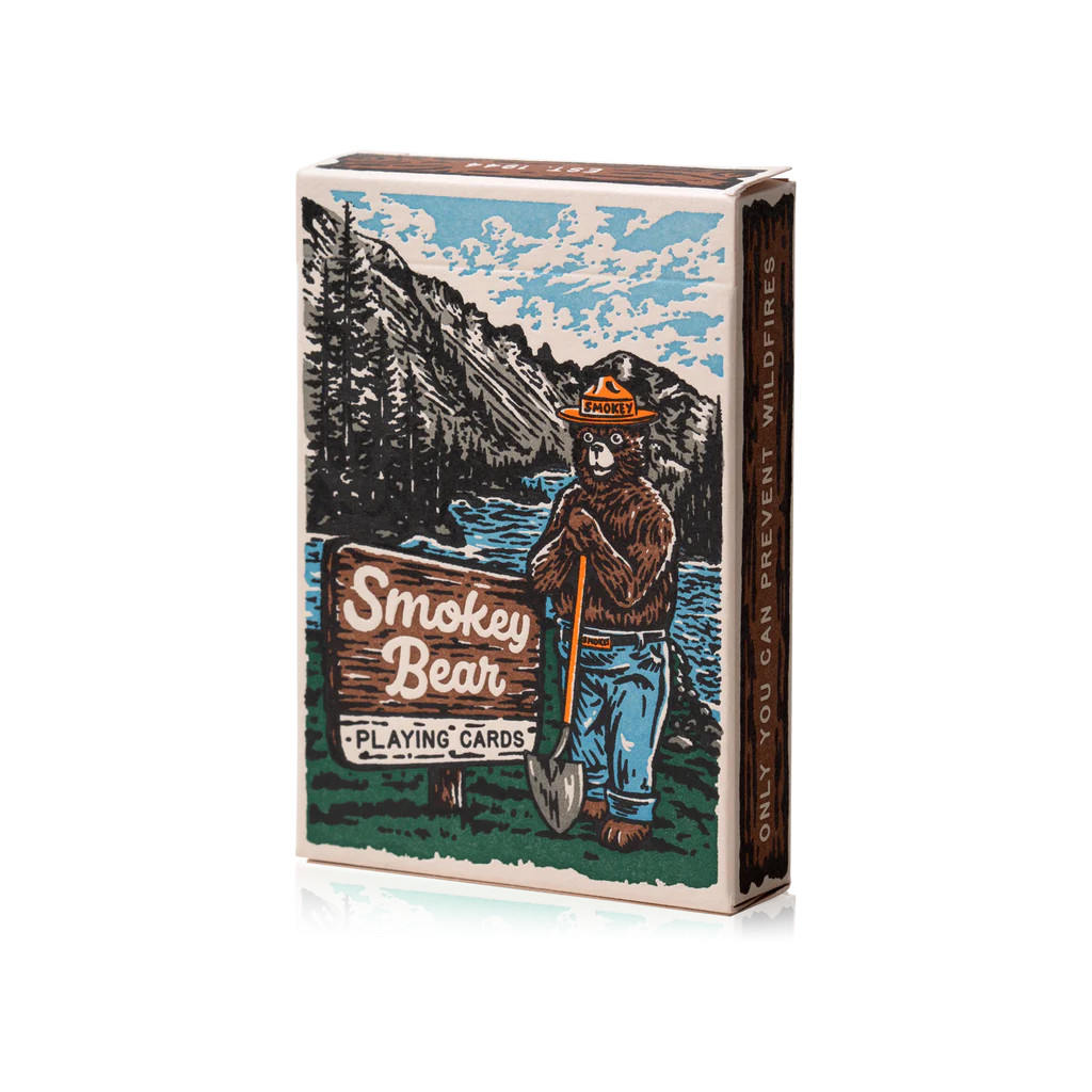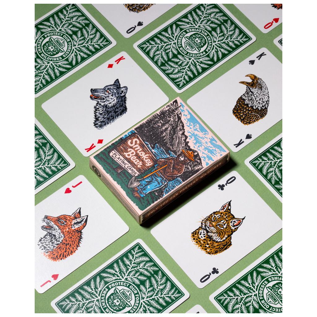 Jeu de cartes officiel Smokey Bear. Conçu en collaboration avec le USDA Forest Service, le jeu met en scène Smokey et douze de ses plus proches amis de la forêt, ainsi que des conseils de prévention des incendies illustrés dans tout le paquet par Sam Larson.