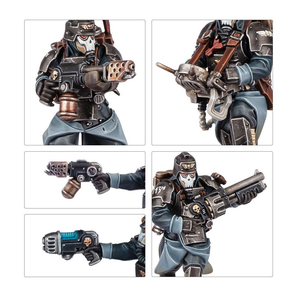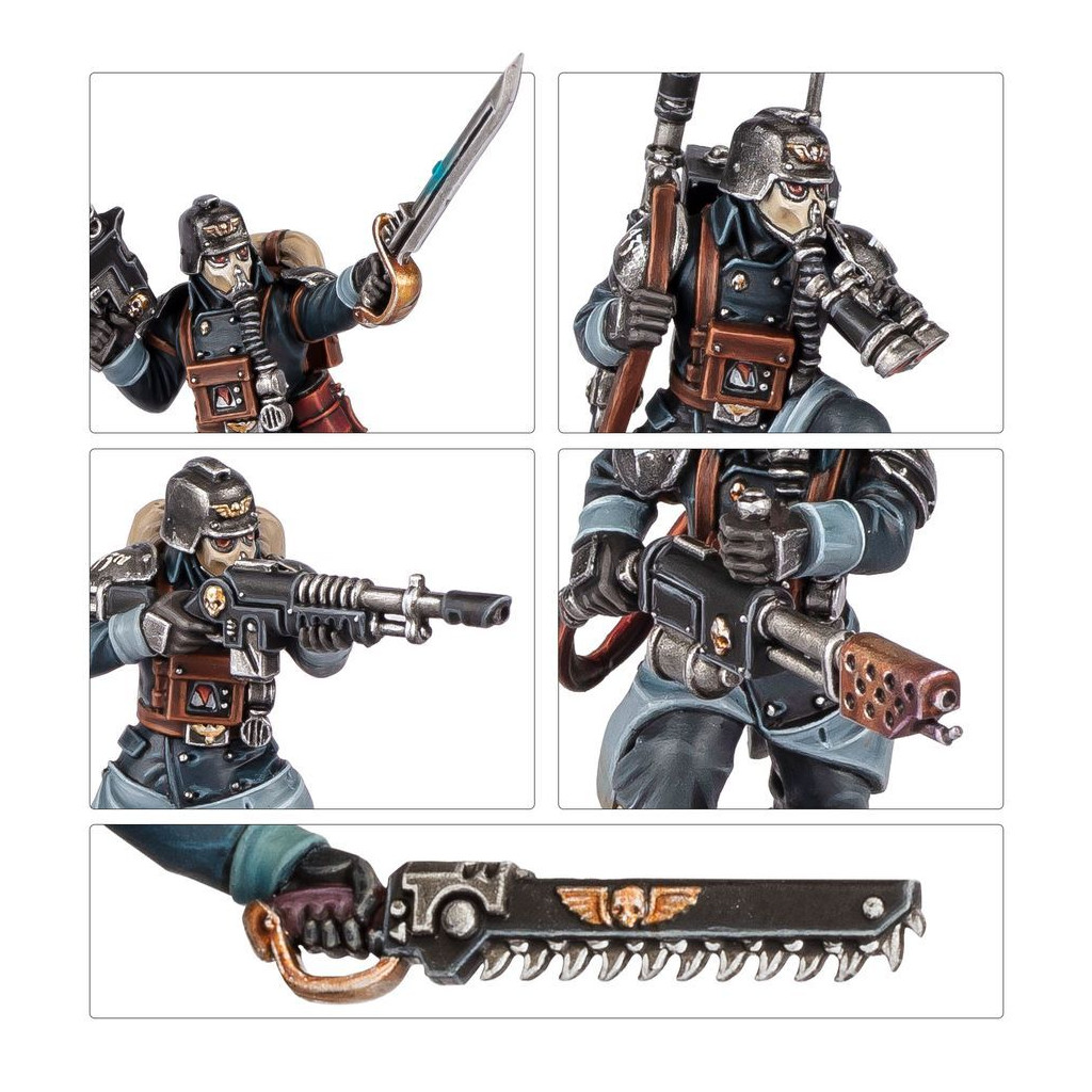 Les figurines de ce kit sont faciles à personnaliser. Le Seigneur Commissaire de l'Escouade d'État-major peut être équipé d'un pistolet à plasma ou d'un fouet, ainsi que d'un gantelet énergétique ou d'une épée énergétique au fourreau avec une main qui pointe du doigt. Un des Gardes Vétérans de l'unité peut être assemblé avec un pistolet laser, un pistolet bolter ou un pistolet à plasma, ainsi qu'avec une épée tronçonneuse, une arme énergétique ou une matraque de tranchée. Un autre Garde Vétéran peut porter un bolter, un fusil à plasma, un fuseur ou un lance-grenades, avec deux accessoires de sac à dos: des grenades ou des munitions de lance-grenades. Les Gardes Vétérans restants peuvent porter respectivement l'étendard régimentaire, un vox de maître ou des contre-agents alchymiques. Vous trouverez également une sélection d'accessoires esthétiques, dont des pelles, pour décorer davantage vos figurines.