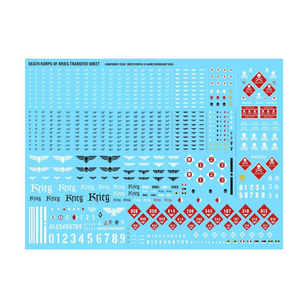 Ce kit est fourni avec 1x Planche de Décalcos du Death Korps de Krieg proposant 803 décalcos de grande qualité pour décorer vos figurines. Cela inclut des marquages pour l'infanterie, les véhicules et l'artillerie, ainsi que des numéros d'escouade et de régiments, des lettrages de Krieg et des marqueurs de champs de mines.