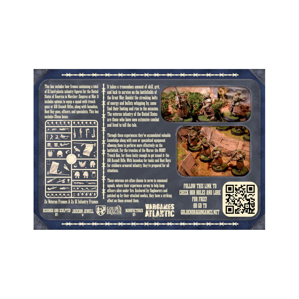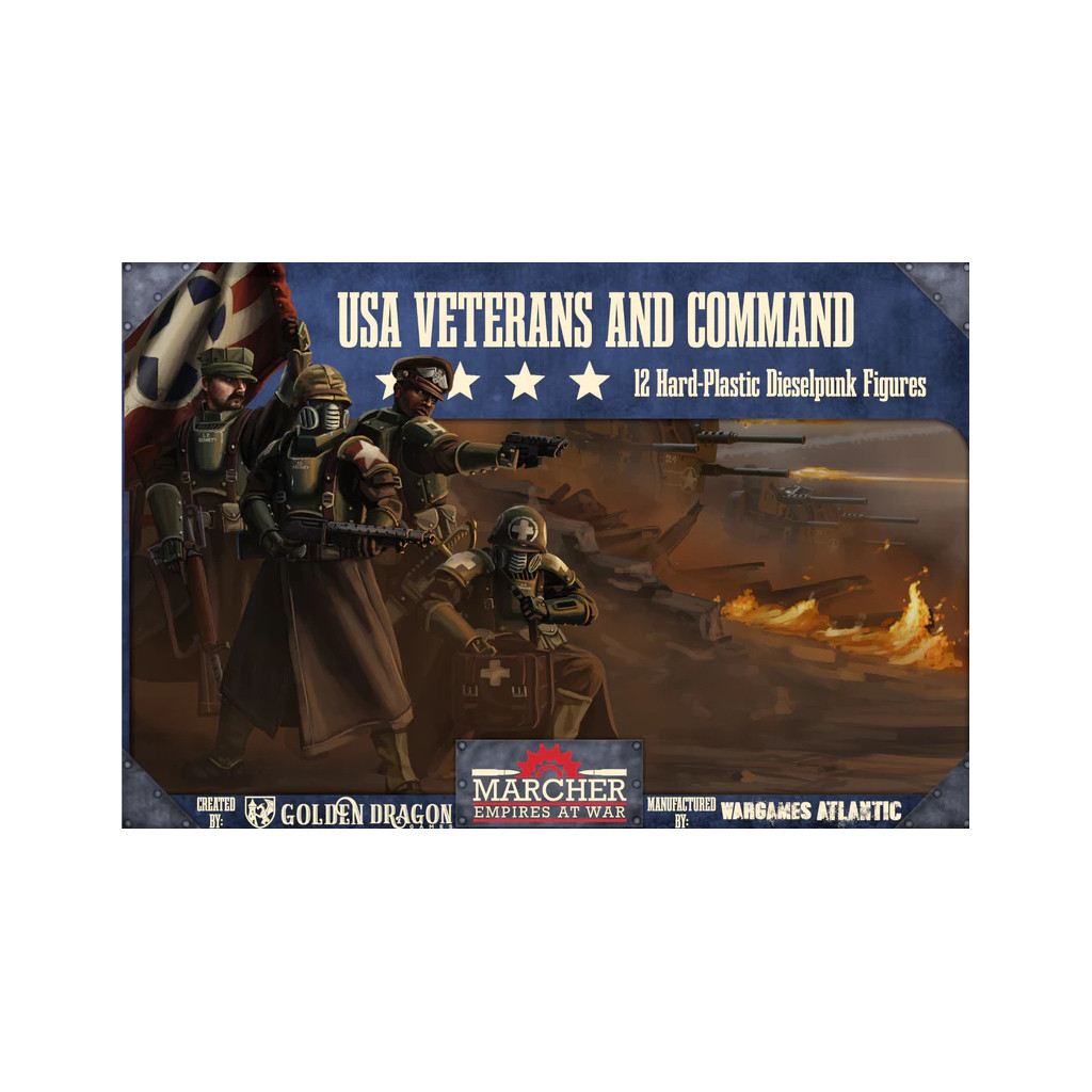 Cette boîte contient quatre châssis comprenant au total 4 figurines d'armures motorisées en plastique dur pour les États-Unis d'Amérique dans Marcher: Empires at War. Elle comprend des options pour une mitrailleuse lourde, une hache de combat, un bouclier de combat ou un fusil. Sont également inclus des socles de 40 mm et une feuille de décalcomanies.