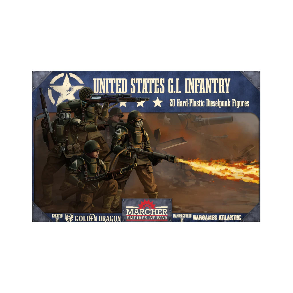 Cette boîte comprend quatre grappes contenant un total de 12 figurines d'infanterie en plastique dur pour les États-Unis d'Amérique dans Marcher : Empires at War. Elle comprend des options pour équiper une escouade de fusils de tranchée ou de fusils d'assaut A16, ainsi que des bazookas, des canons à rayons thermiques, des officiers et des spécialistes. Cette boîte comprend des socles de 25 mm.