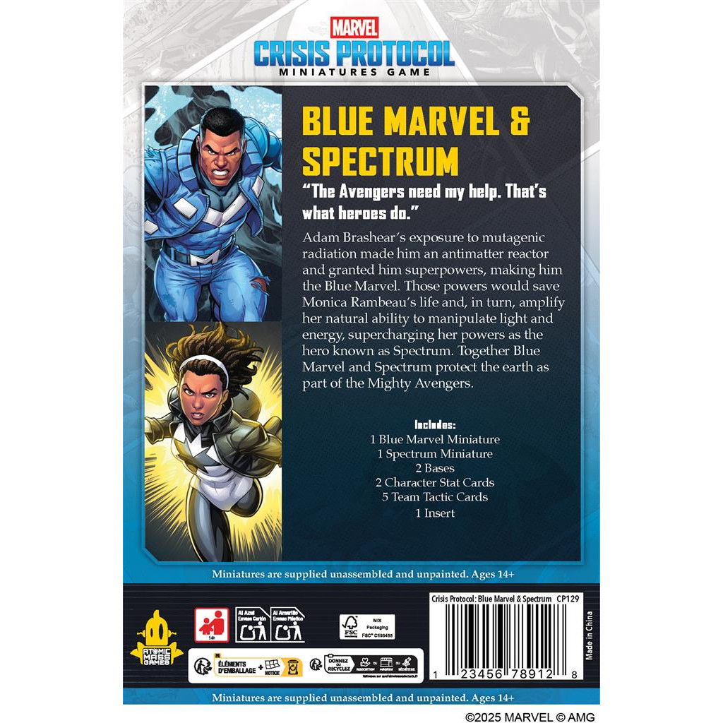 Ce pack apporte donc deux nouveaux personnages à Marvel : Crisis Protocol™. Spectrum dispose du pouvoir "Plus forts ensemble que Seuls" utilisable sur les personnages affiliés aux Mighty Avengers. Il permet de transférer une partie du pouvoir gagné à ses alliés. Blue Marvel sert de son côté de puissant tank tout en causant de gros dégâts à longue et courte portée. Figurines à monter et non peintes.