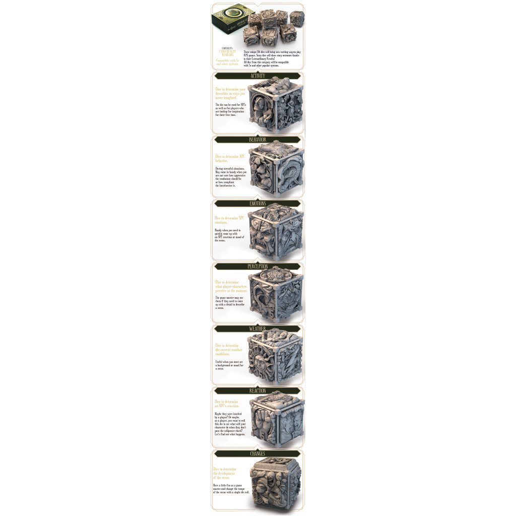 Ces dés D6 uniques apporteront de nouvelles façons passionnantes de jouer aux jeux de rôle. Les dés narratifs révéleront le dénouement de l'histoire grâce à leurs résultats extraordinaires ! Tous les dés de cette catégorie sont compatibles avec la 5e édition et d'autres systèmes populaires.