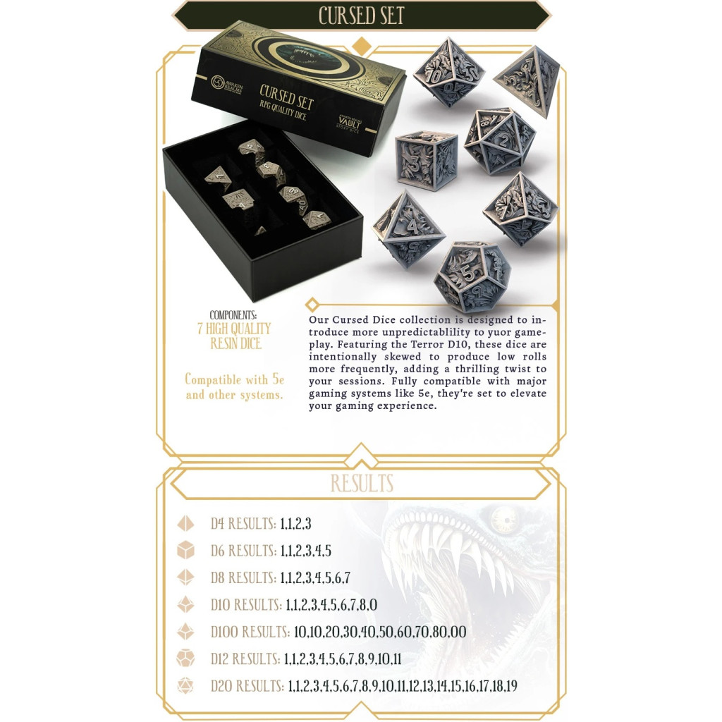 Ce set de dés maudits, avec leurs petits chiffres et leur probabilité plus élevée de sortir, vous garantissent des lancers vraiment effrayants ! Les dés maudits sont entièrement compatibles avec les systèmes populaires tels que la 5ème édition.