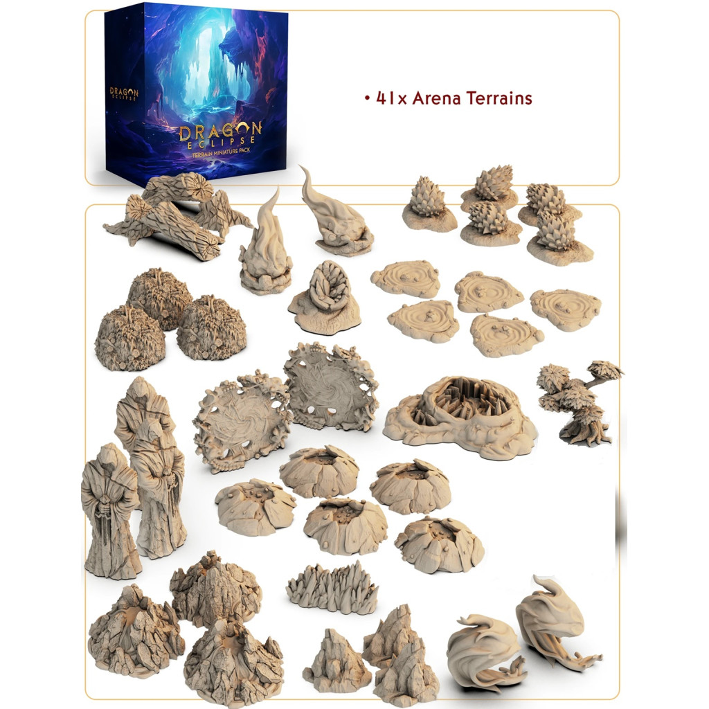 Dragon Eclipse: Terrain Miniature Pack comprend 41 miniatures de terrain de haute qualité qui peuvent être utilisées à la place des jetons Arena et d'autres objets pour apporter plus d'immersion à la table ! Cette extension est purement esthétique - elle n'apporte aucune valeur ajoutée au gameplay. Figurines livrées avec une finition Sundrop.