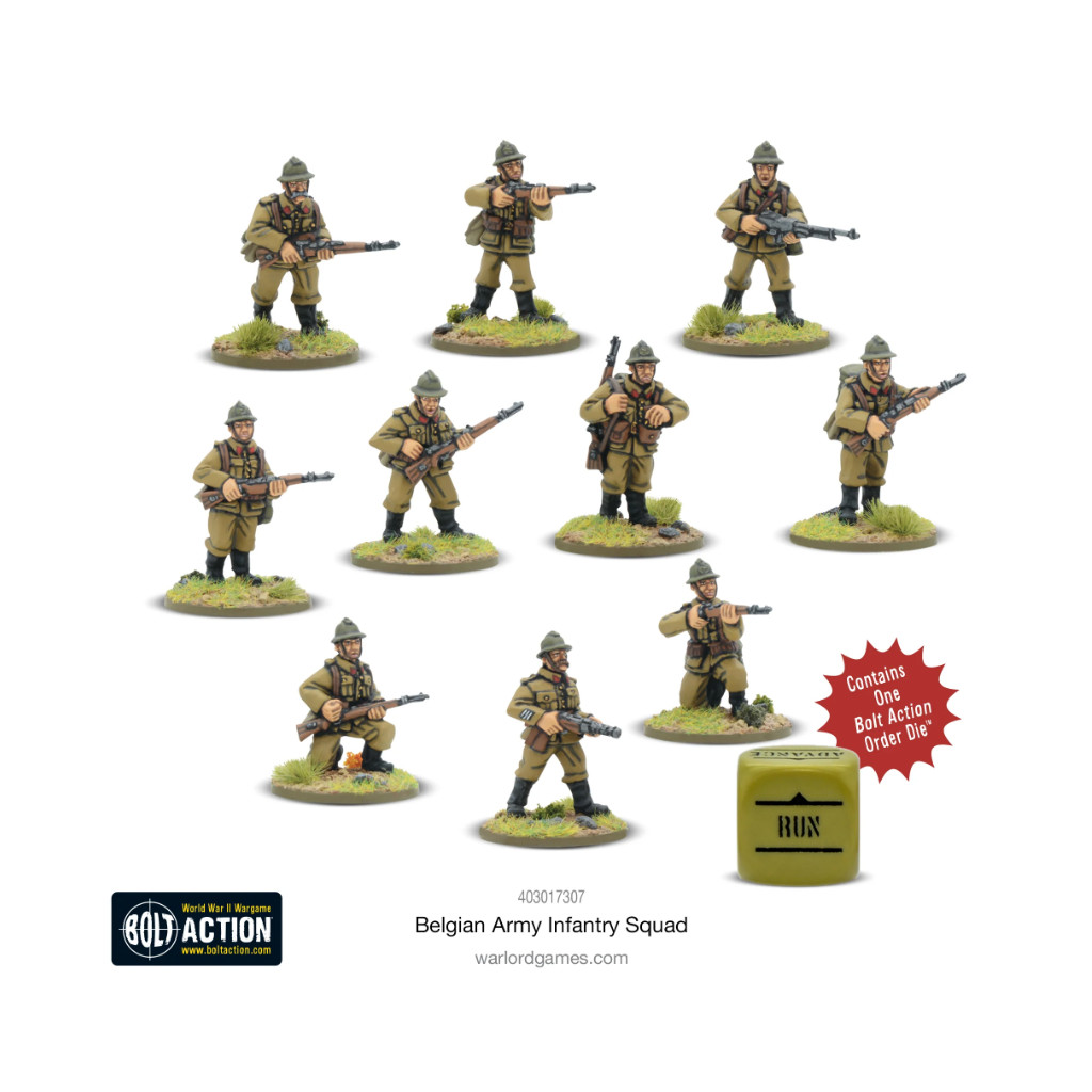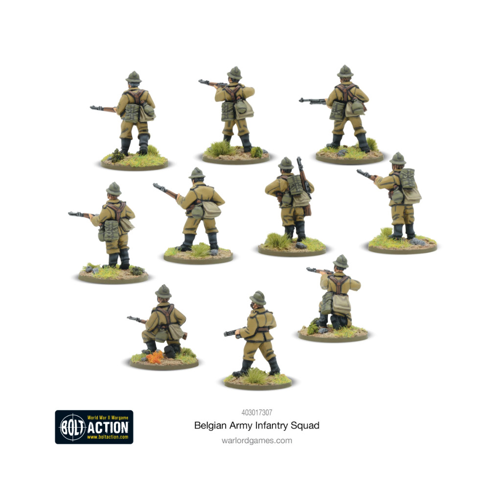 Une section d'infanterie belge se compose de dix hommes. Une section est dirigée par un sergent portant soit un pistolet mitrailleur MP-28, soit un fusil modèle 1889. Le sergent est secondé par un caporal portant un fusil. Le fusil-mitrailleur 1930 (FM 30) Browning Light Machine Gun ou "Belgian BAR" servait de section LMG et était portée et manœuvrée par un seul homme. Les sept autres fusiliers portaient le fusil modèle 1889, dont l'un était adapté au tir de grenades.