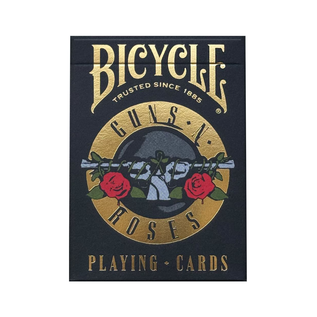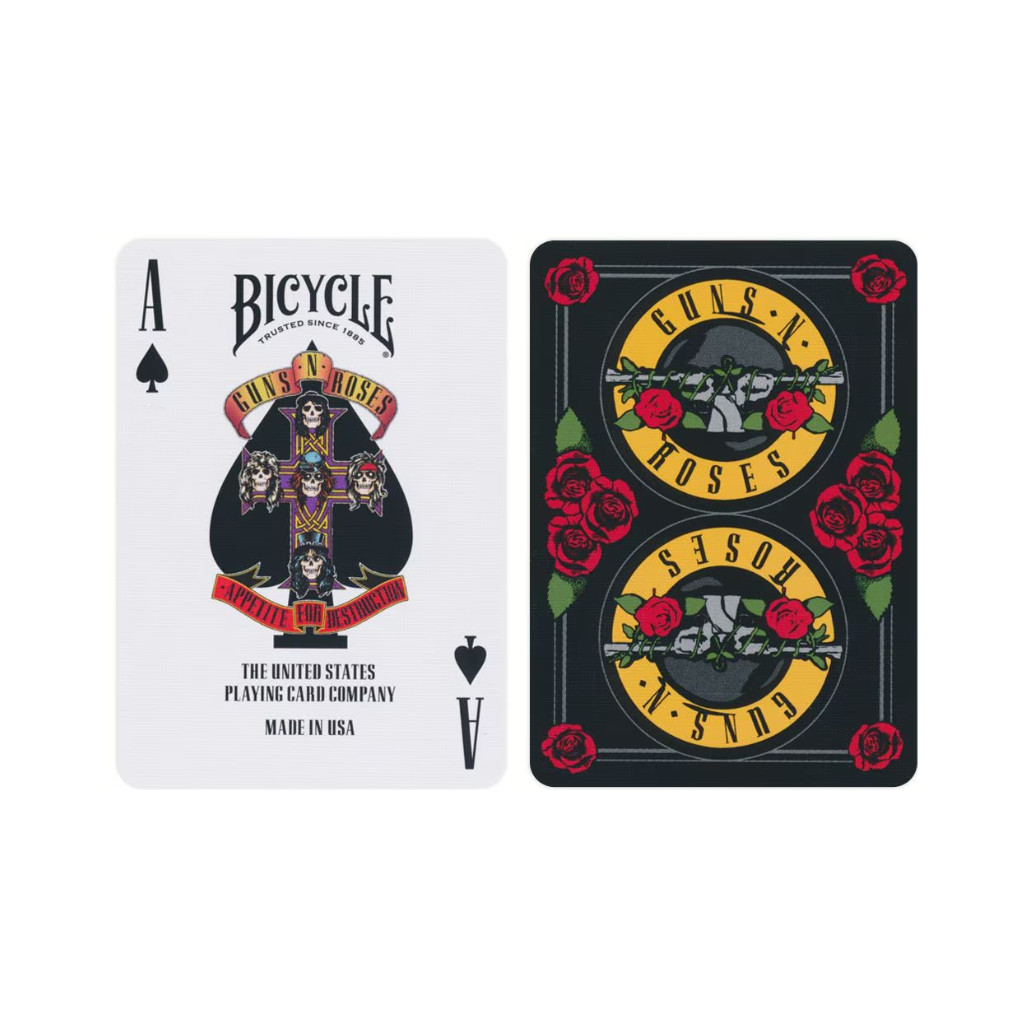 Les cartes Bicycle Guns N’ Roses mettent en avant les illustrations emblématiques de la pochette de l’album Appetite for Destruction de GN’R. Le tuck box est orné de détails en dorure, ajoutant une touche premium et audacieuse. Chaque mélange apporte un peu de Paradise City à votre table de jeu.