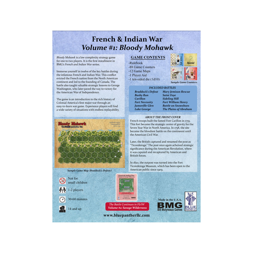 Bloody Mohawk est un jeu de stratégie à faible complexité pour un à deux joueurs. Il constitue le premier volet de la série de BMG consacrée à la Guerre de la Conquête.