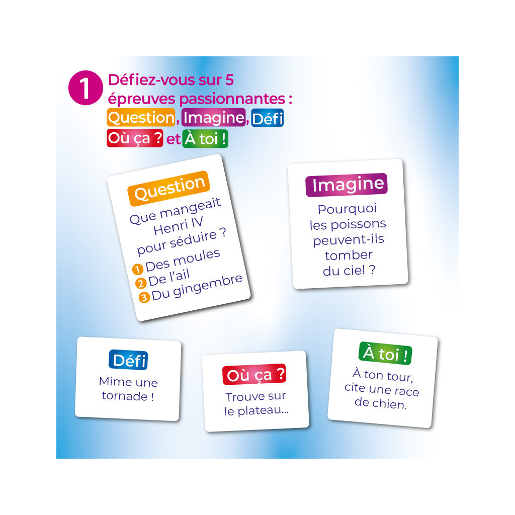 Plus de 1 000 nouvelles épreuves surprenantes, une nouvelle façon de jouer et 3 plateaux en un pour aller encore plus loin ! La règle du jeu est simple : les joueurs se défient sur 5 épreuves délirantes : Question, Imagine, Défi, Où ça ? et À toi !