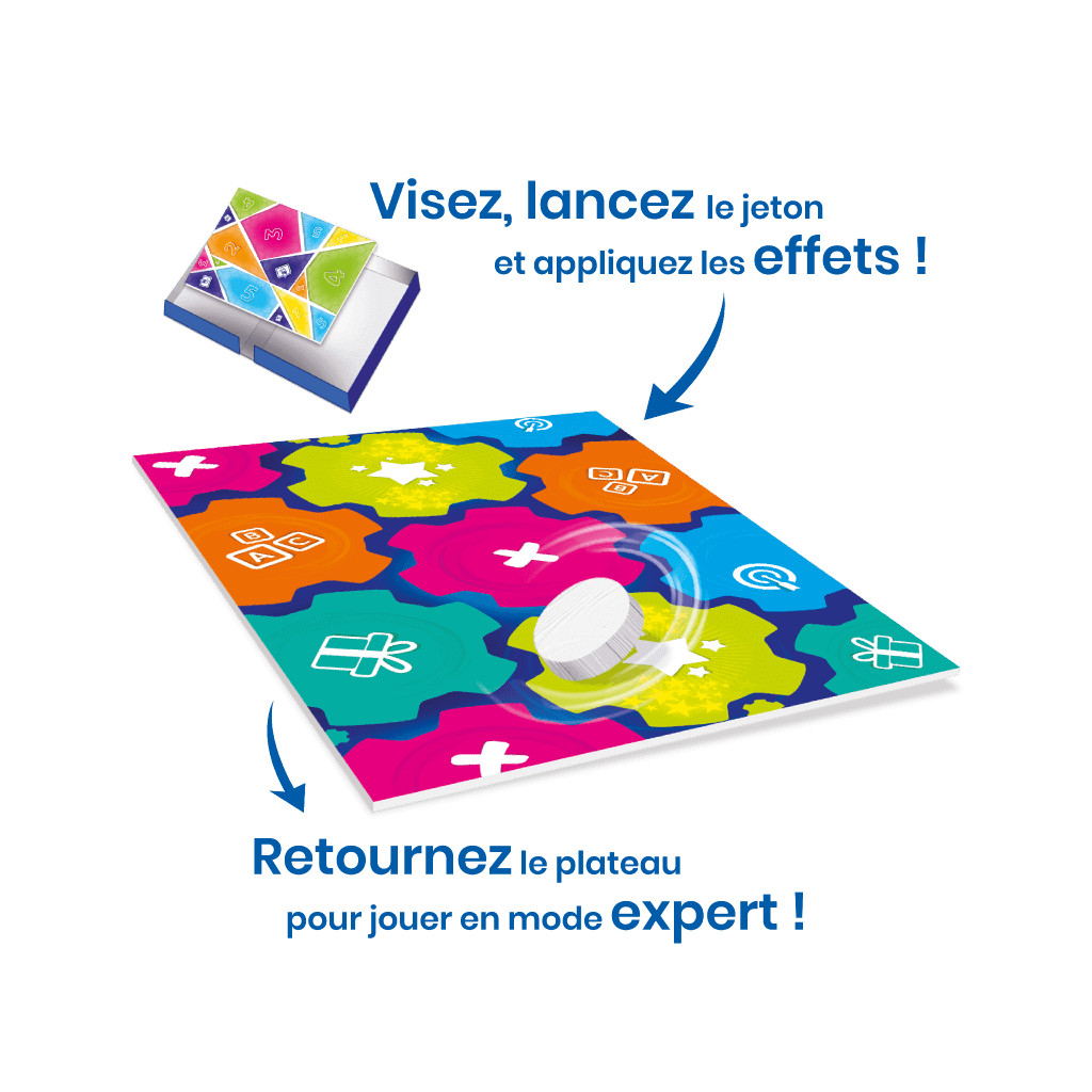 Nouveau ! Règle Expert avec un nouveau plateau : les joueurs tentent de deviner les mots avec moins d’indices, à l’aide de l’illustration ou de l’information de Maestro sur la carte. Ils lancent le jeton sur le nouveau plateau afin de connaître les indices à énoncer. Ce plateau est utilisable avec tous les jeux de la collection Enigmes !