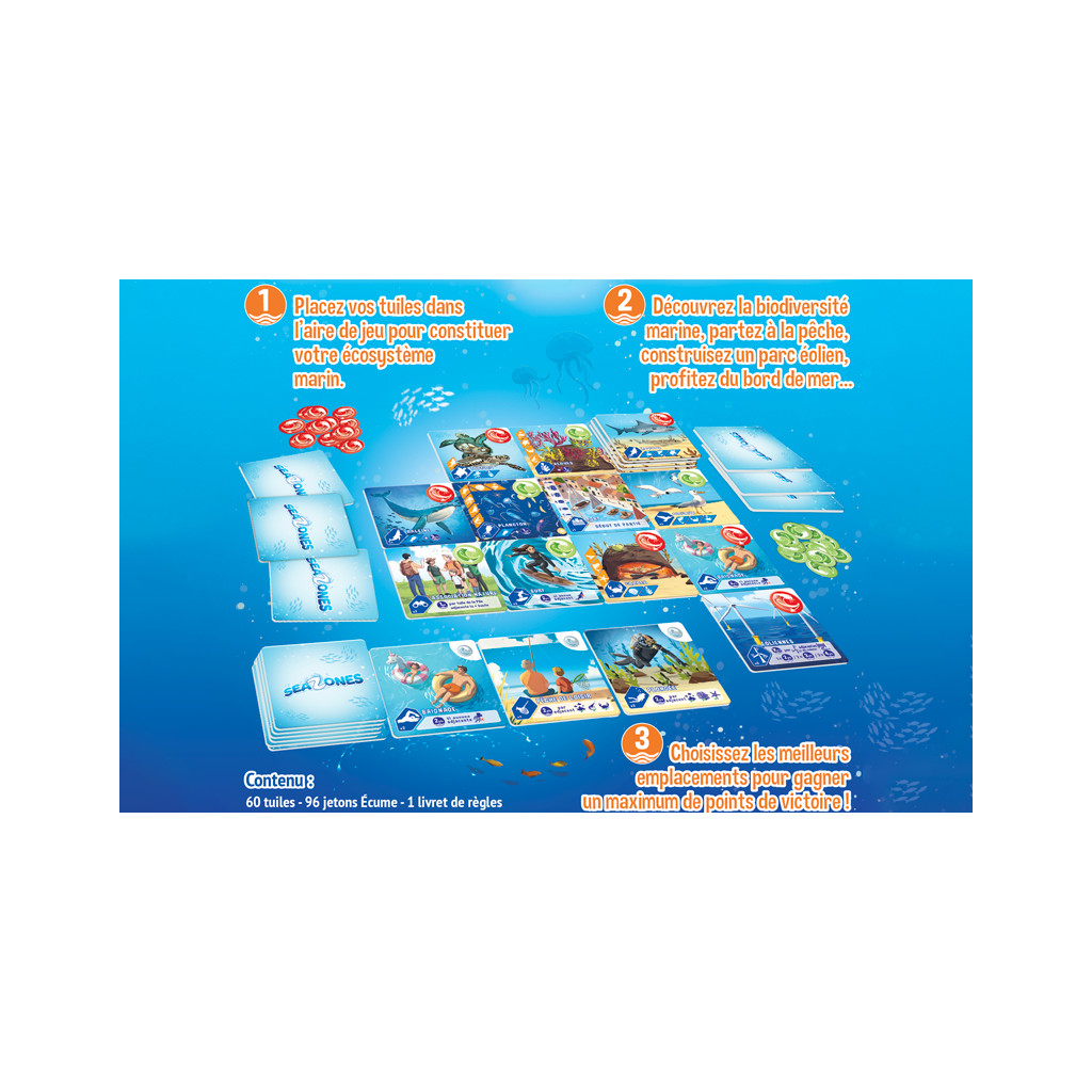 Dans Sea Zones, découvrez les interactions entre la biodiversité et les activités humaines. Chacune des tuiles représente une espèce marine ou une activité humaine en lien avec l’Océan. Bien placées, elles vous rapporteront un maximum de points de victoire. Saurez-vous adopter la bonne stratégie pour remporter la partie ?